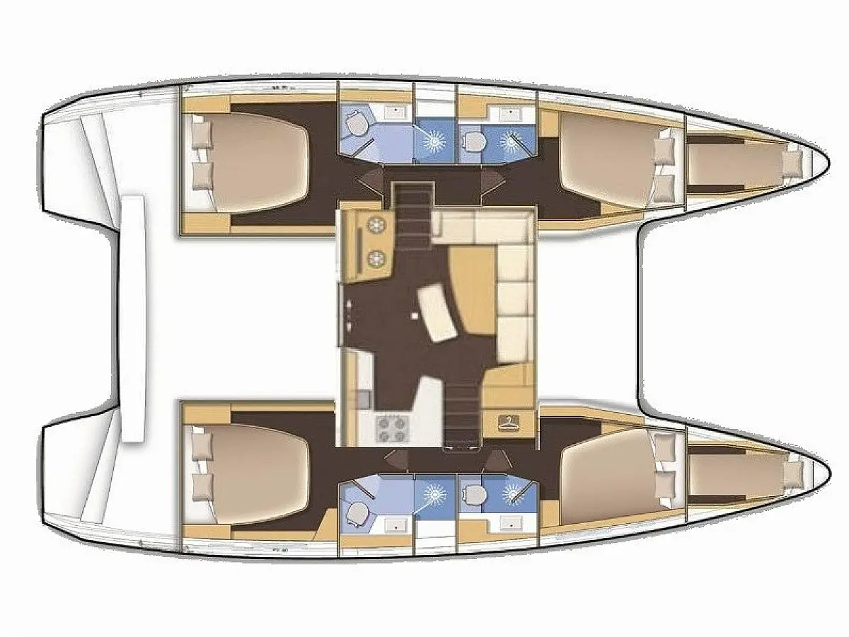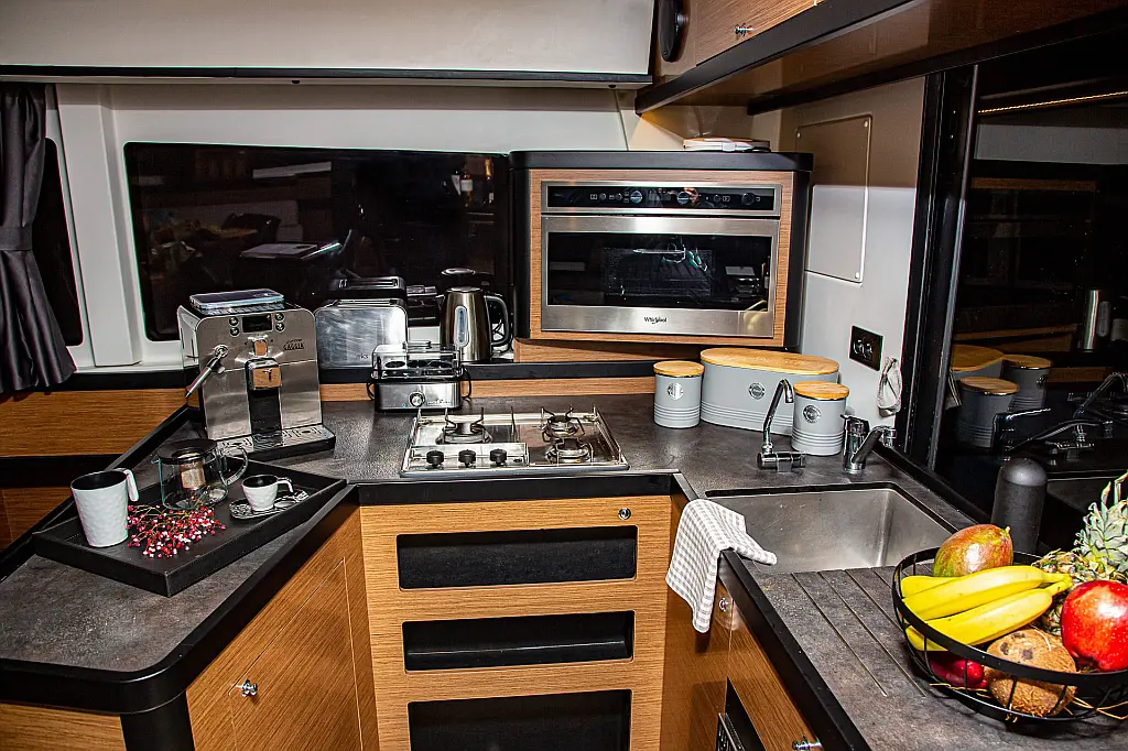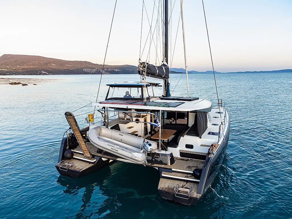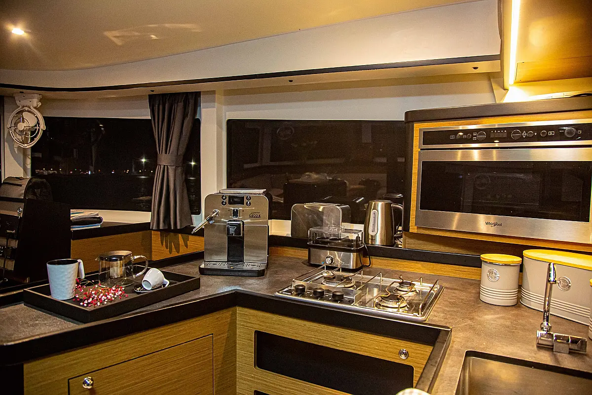 Kühlschrank, Klimaanlage, Bimini, Cockpit-Kissen, Lautsprecher im Cockpit, Beiboot, Kaffeemaschine, Elektrische Toilette, Generator, Heizung, Fäkalientank, Inverter, Außenbordmotor, Teak Cockpit, Wi-Fi und Internet