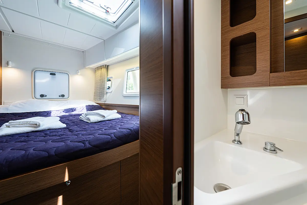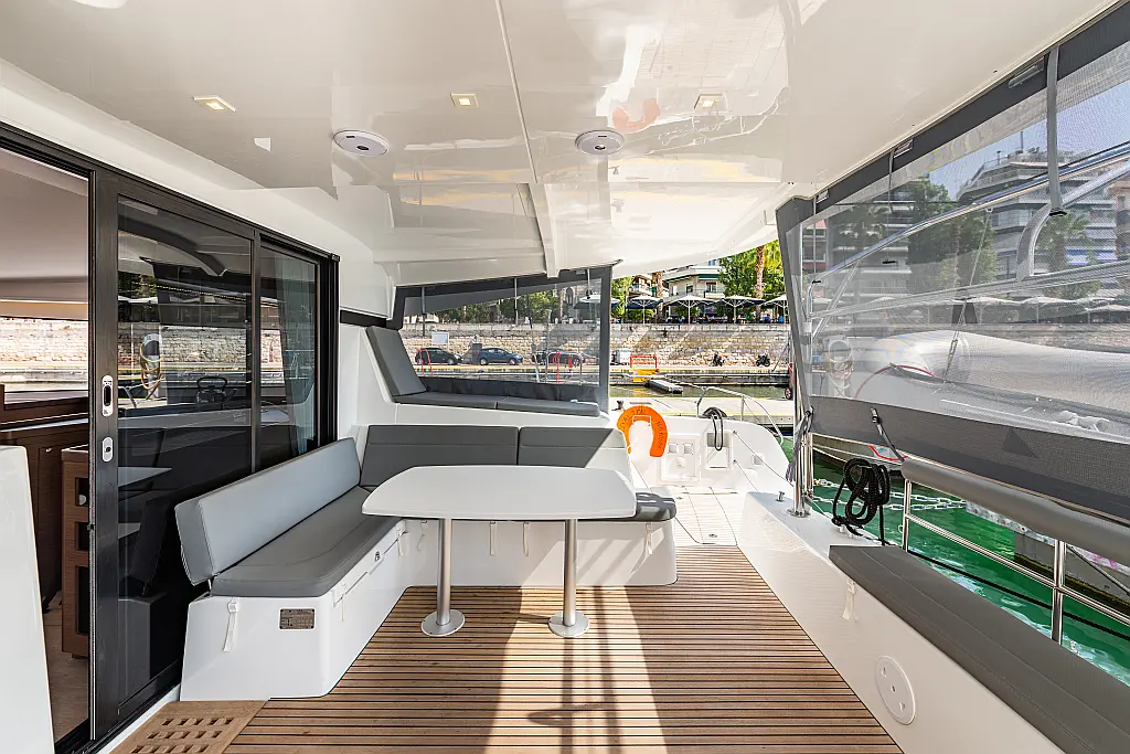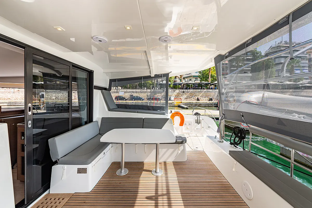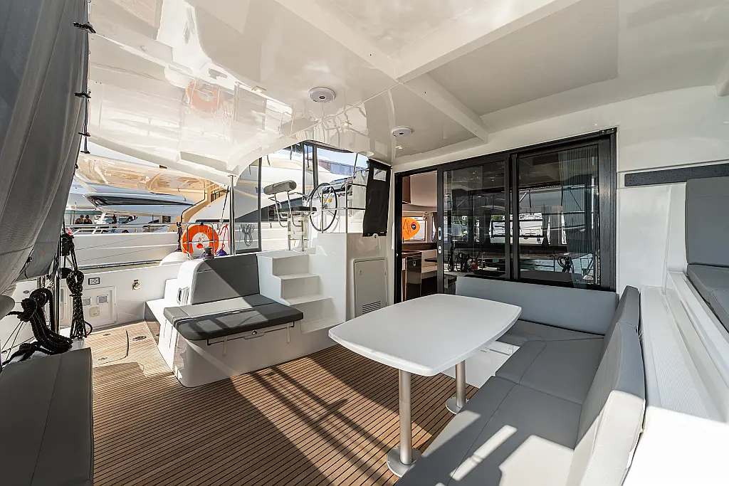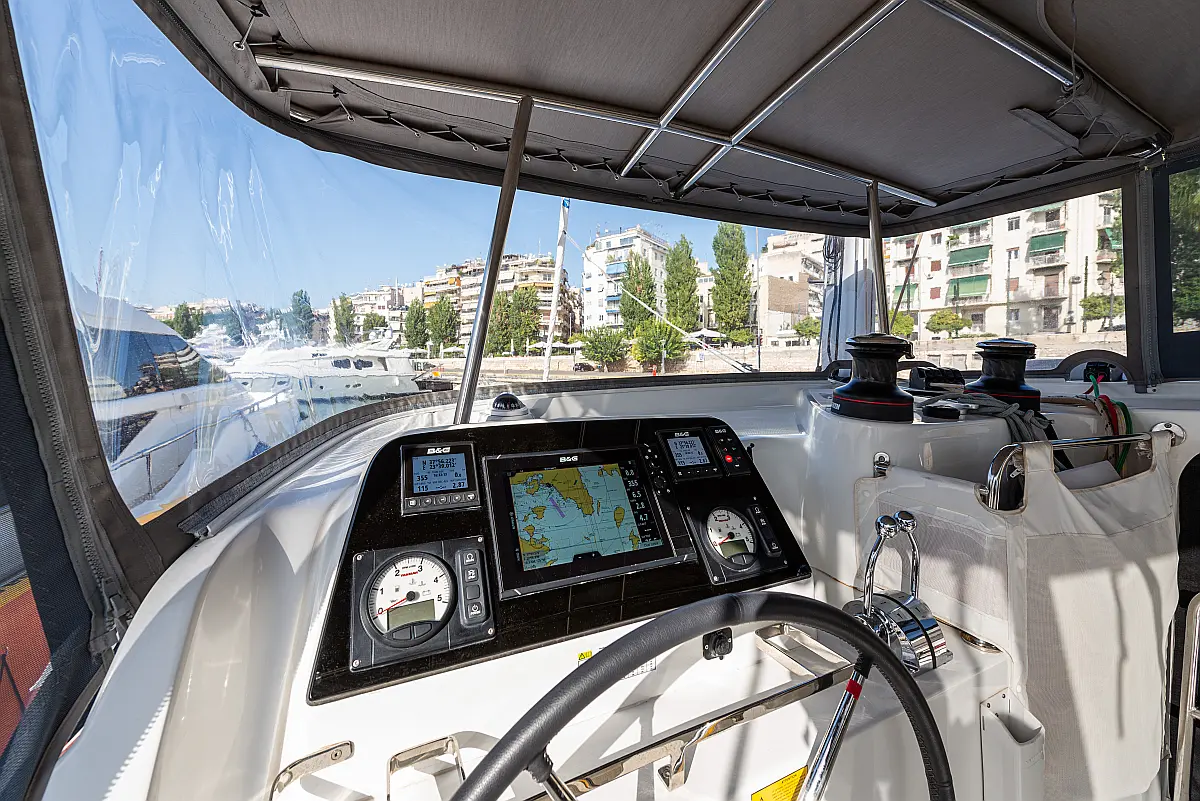 Fäkalientank, Lautsprecher im Cockpit, Elektrische Winch (Segel), Elektrische Toilette, Klimaanlage, Wassermacher, Generator, Cockpit-Kissen, Beiboot, Sprayhood, Badeplattform, Teak Cockpit, Bimini, Solar-Panele