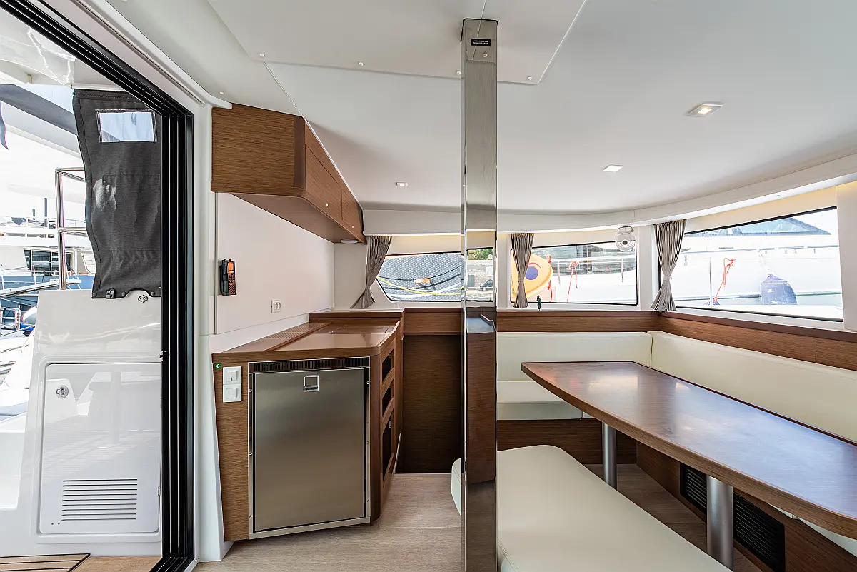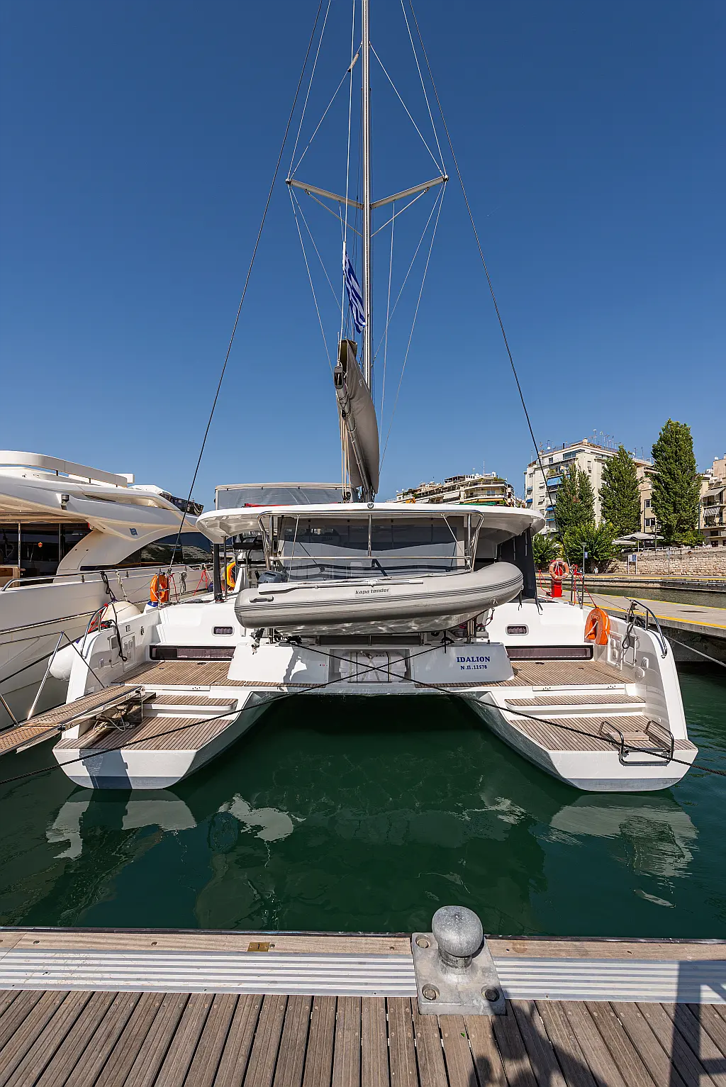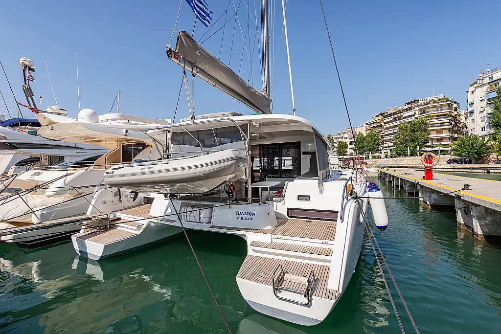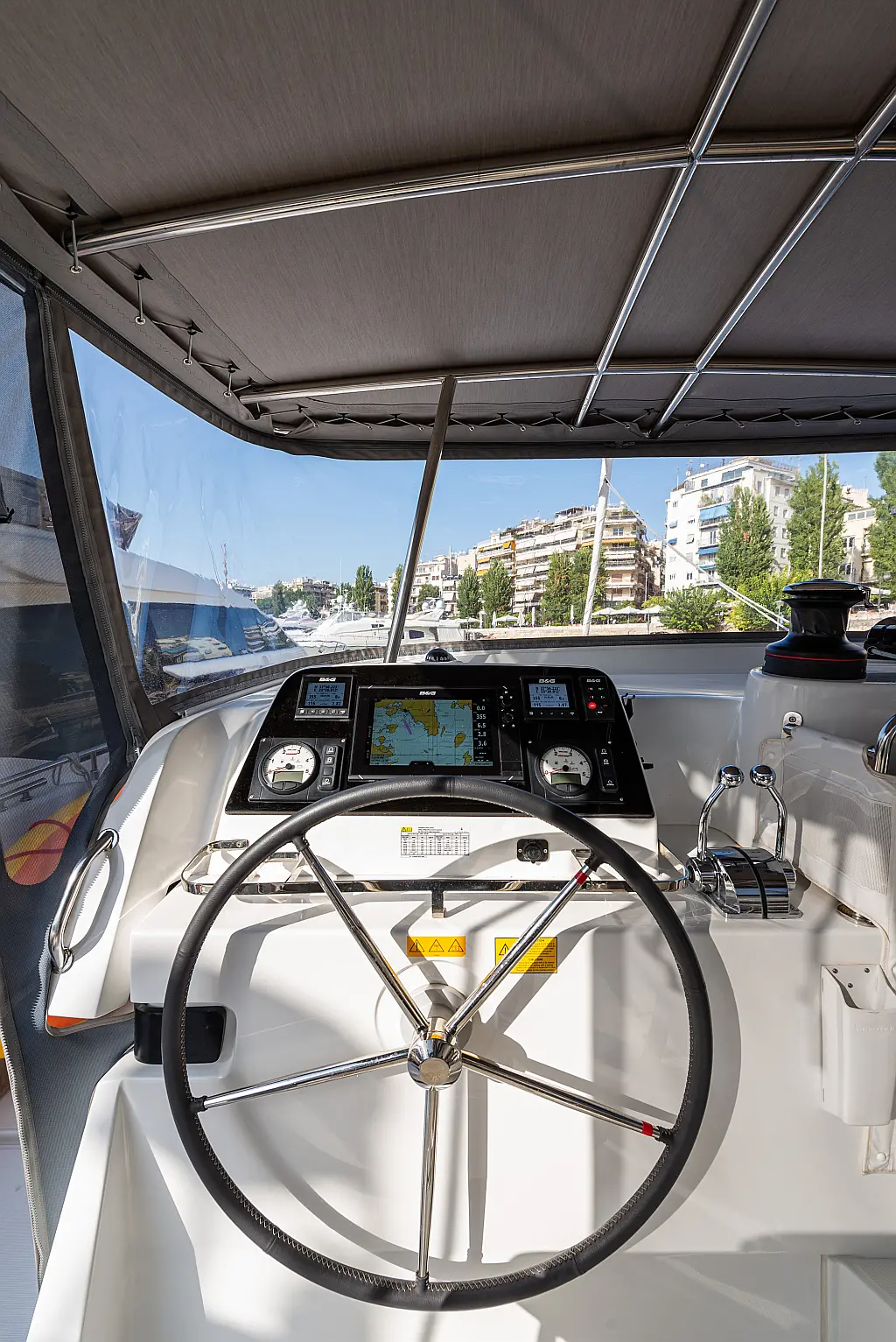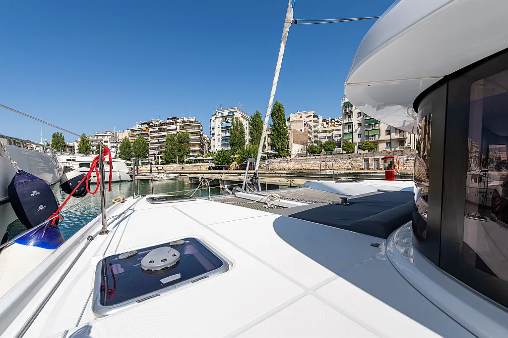 Fäkalientank, Lautsprecher im Cockpit, Elektrische Winch (Segel), Elektrische Toilette, Klimaanlage, Wassermacher, Generator, Cockpit-Kissen, Beiboot, Sprayhood, Badeplattform, Teak Cockpit, Bimini, Solar-Panele