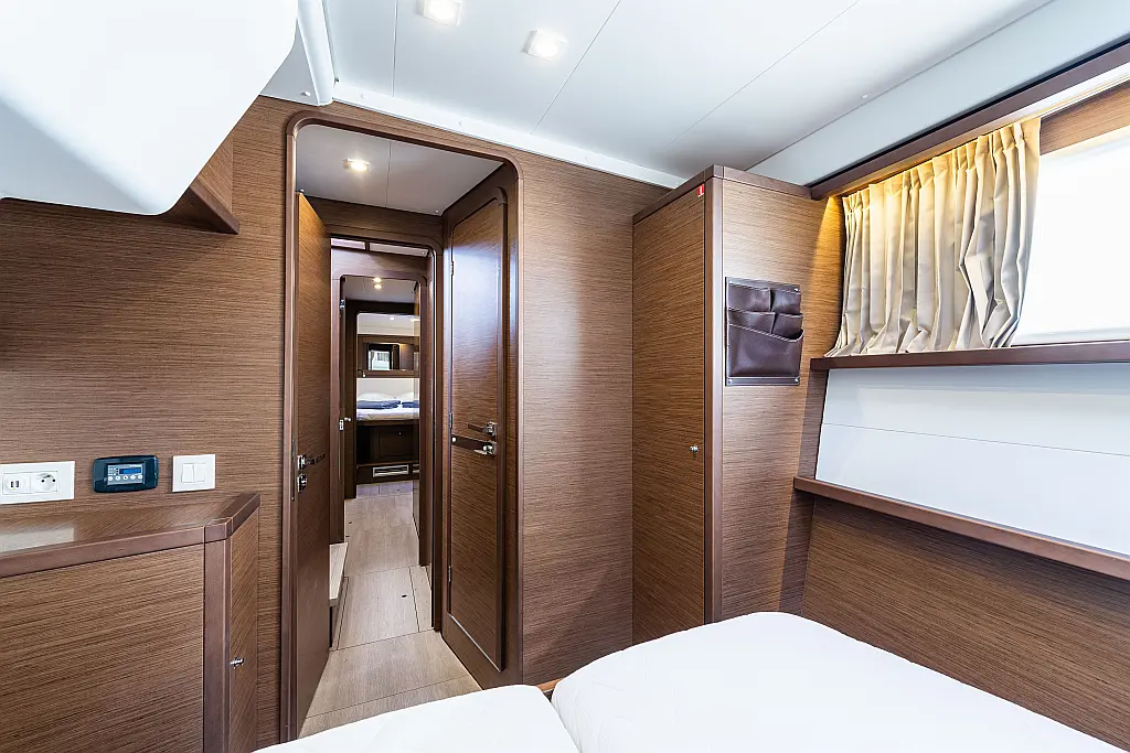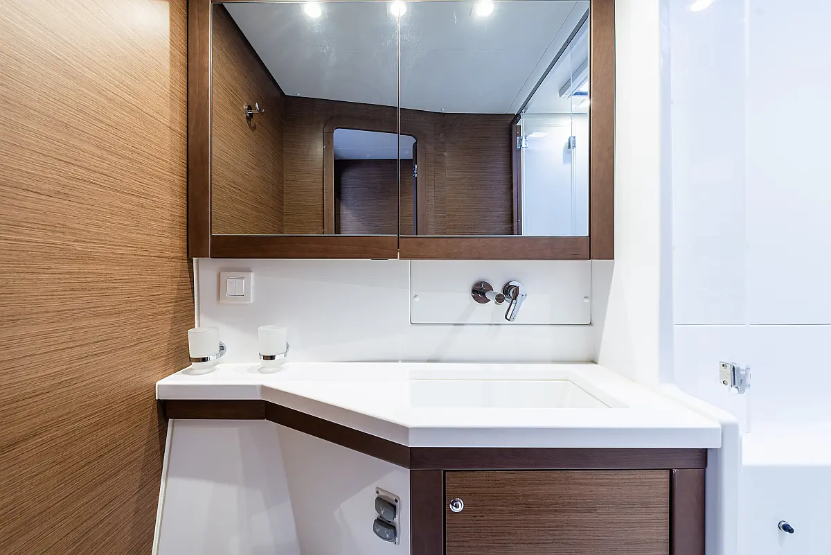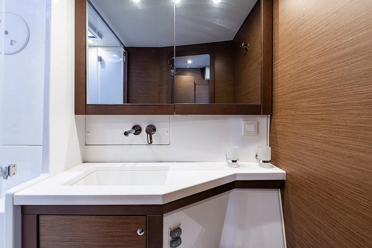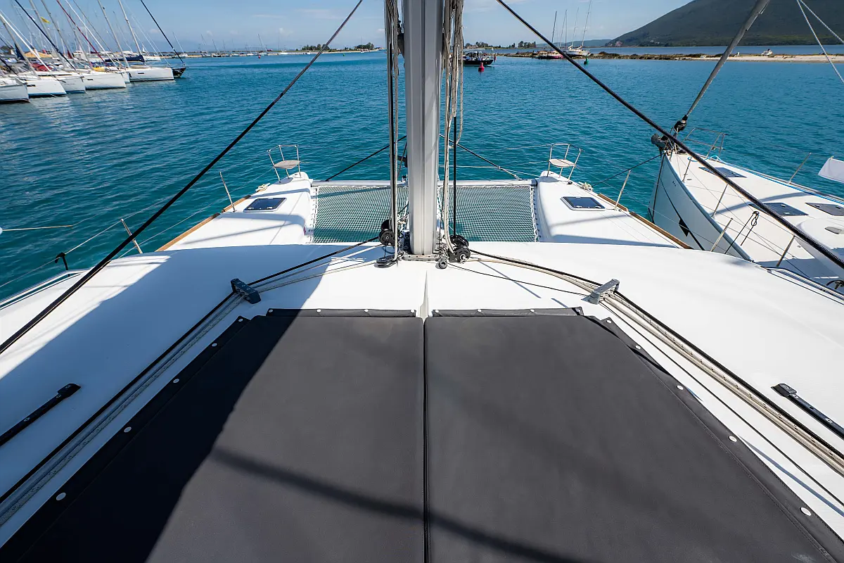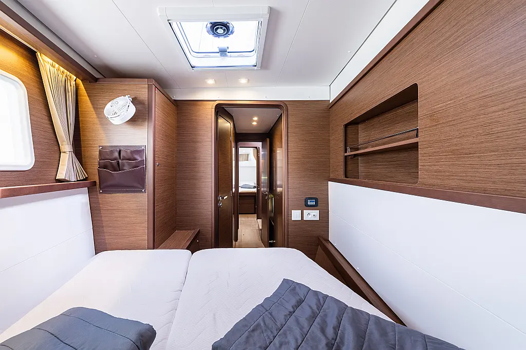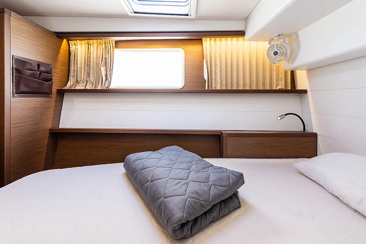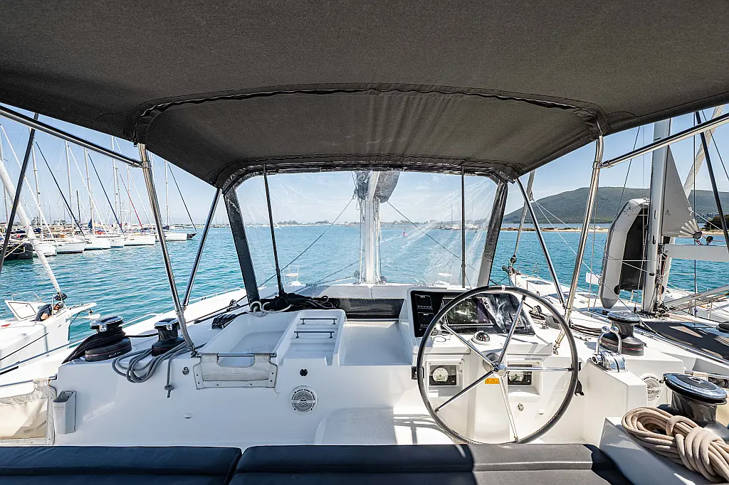 Fäkalientank, Bimini, Beiboot, Lautsprecher im Cockpit, Elektrische Winch (Segel), Elektrische Toilette, Klimaanlage, Wassermacher, Generator, Cockpit-Kissen, Sprayhood, Badeplattform, Solar-Panele