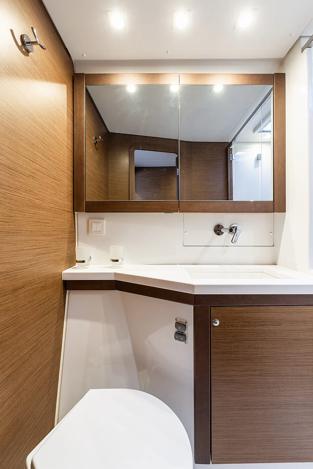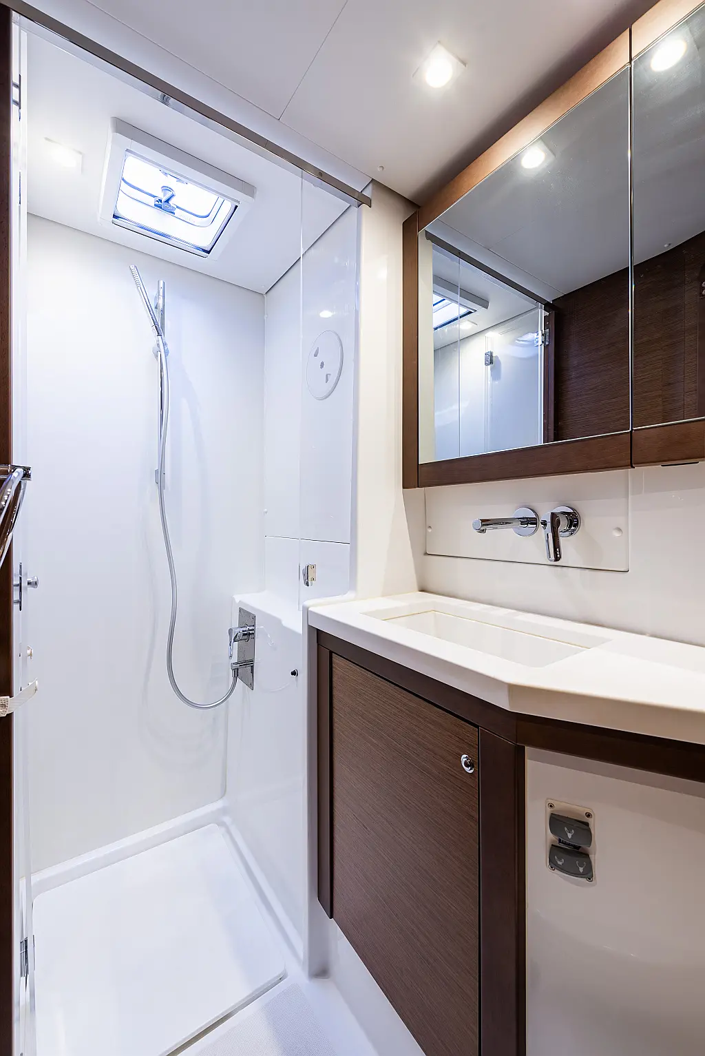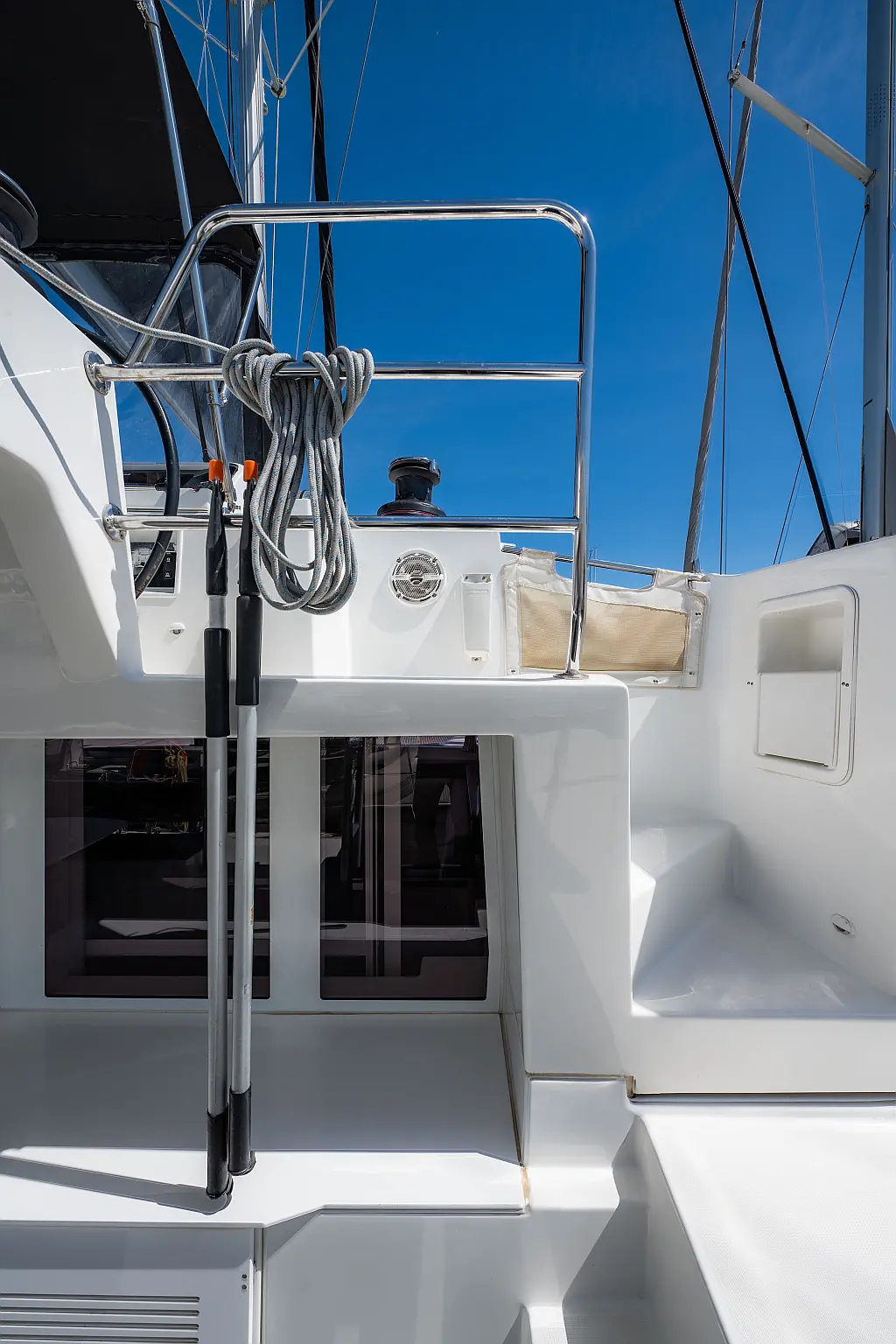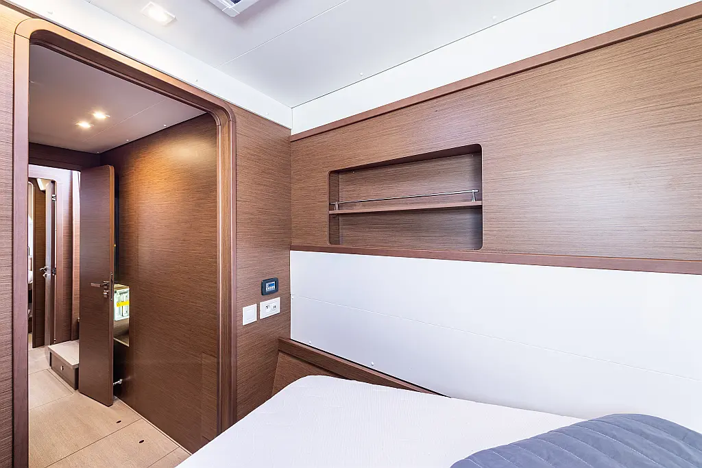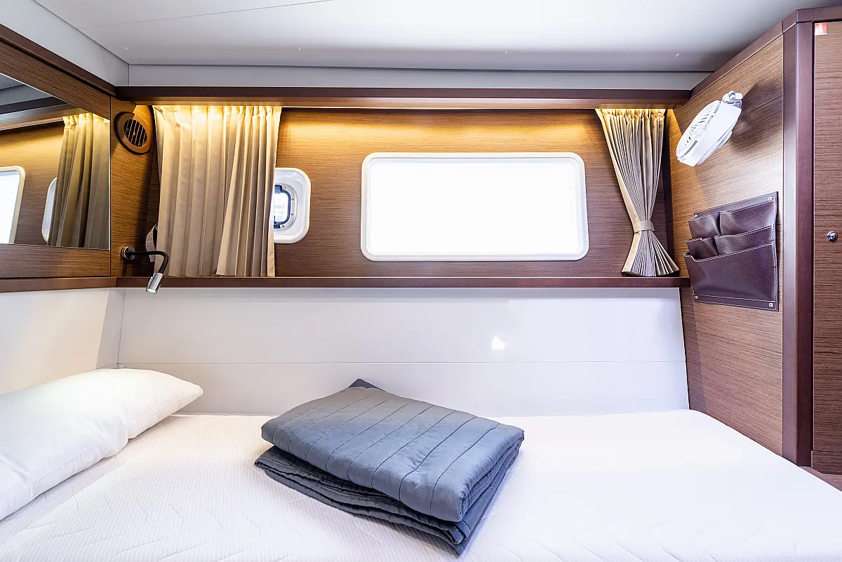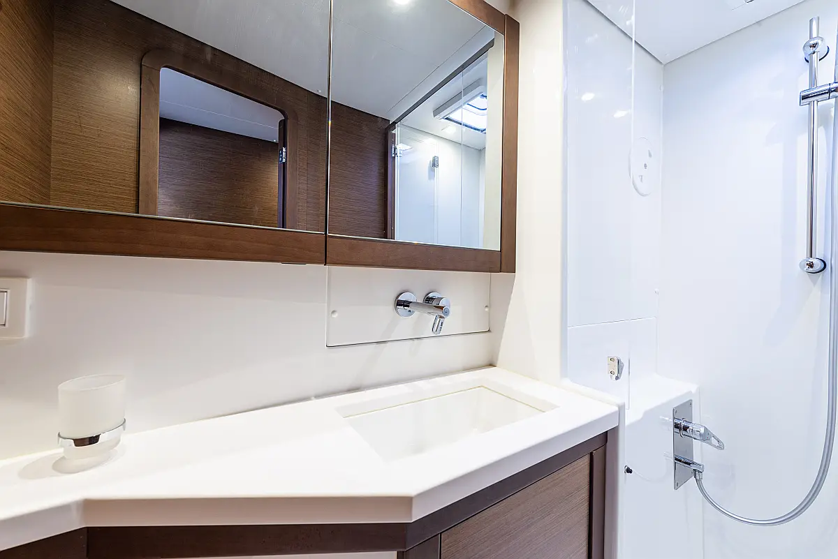 Fäkalientank, Bimini, Beiboot, Lautsprecher im Cockpit, Elektrische Winch (Segel), Elektrische Toilette, Klimaanlage, Wassermacher, Generator, Cockpit-Kissen, Sprayhood, Badeplattform, Solar-Panele