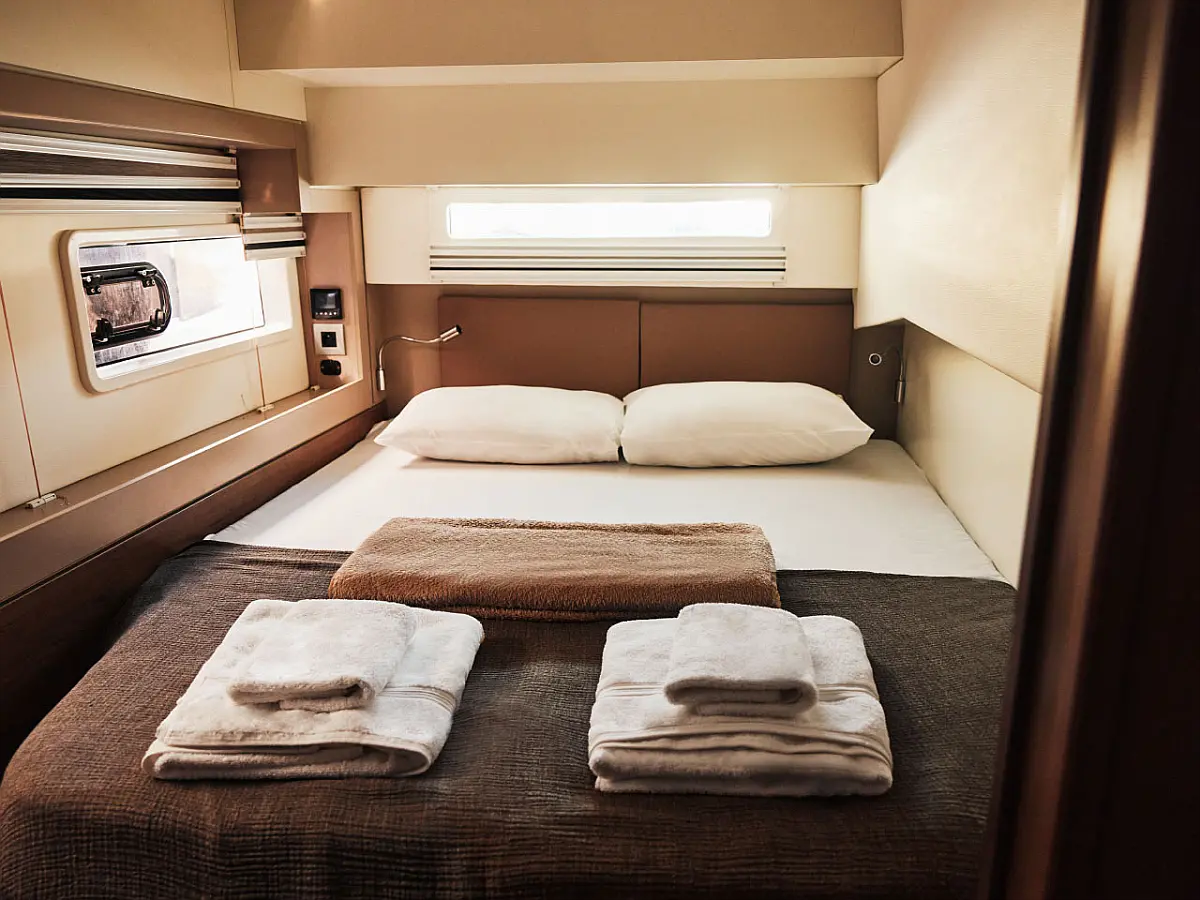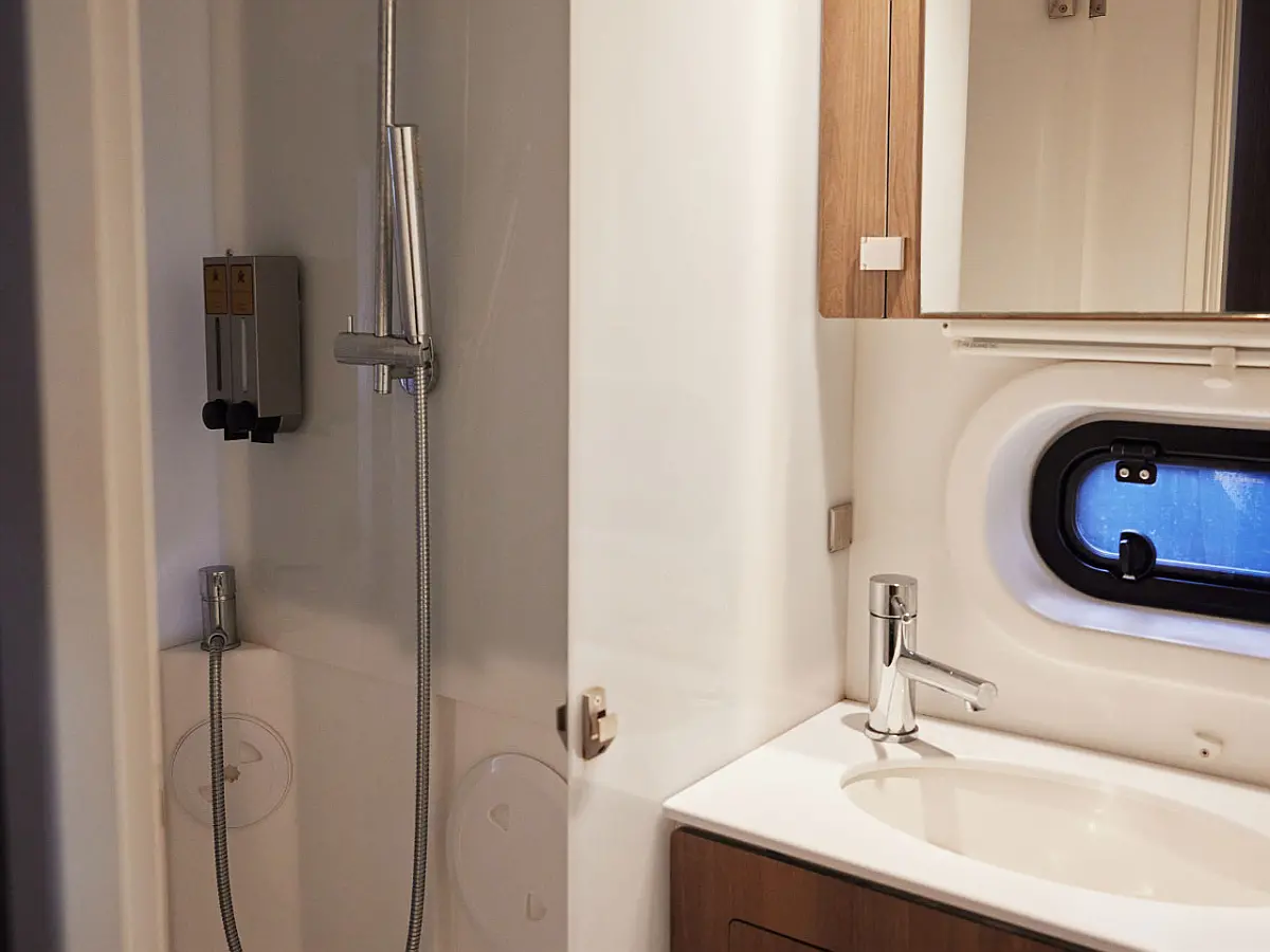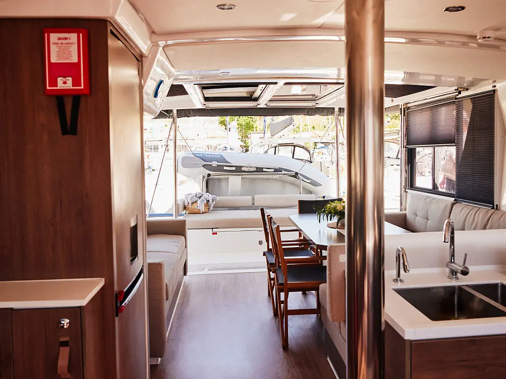 Kylskåp, cockpitkuddar, Soltak, Gummibåt, solpaneler, Generator, Luftkonditionering, Inverter, vatten maker