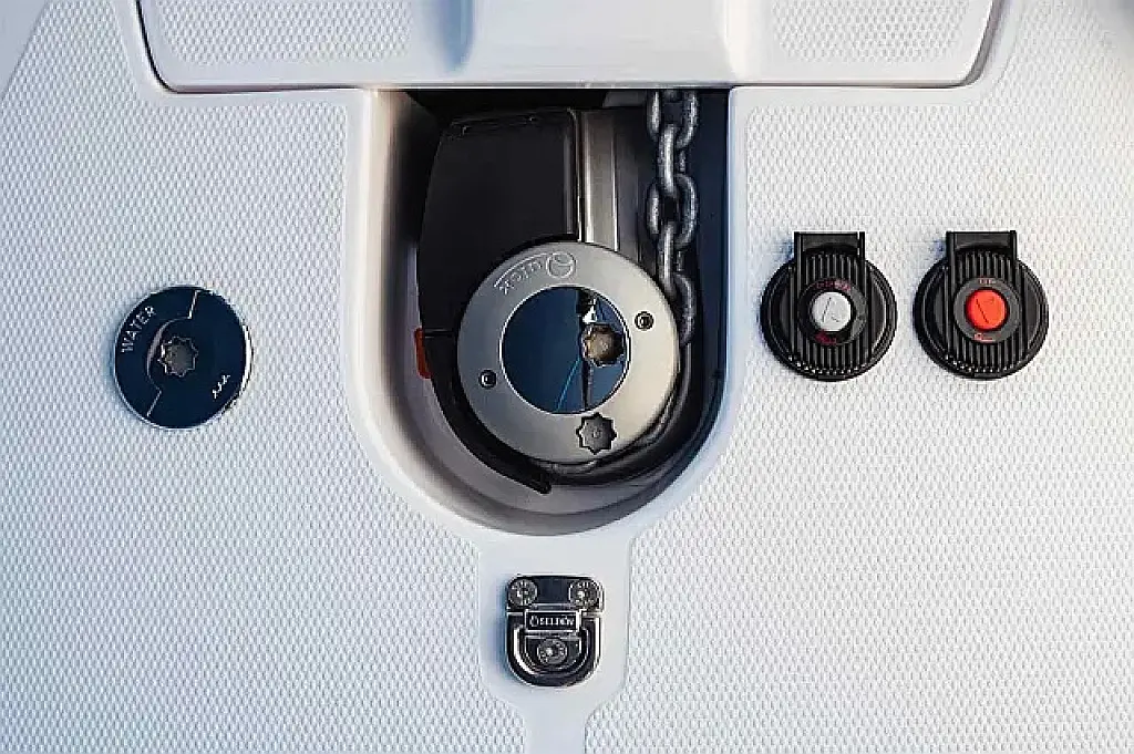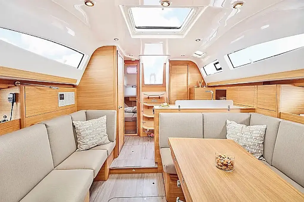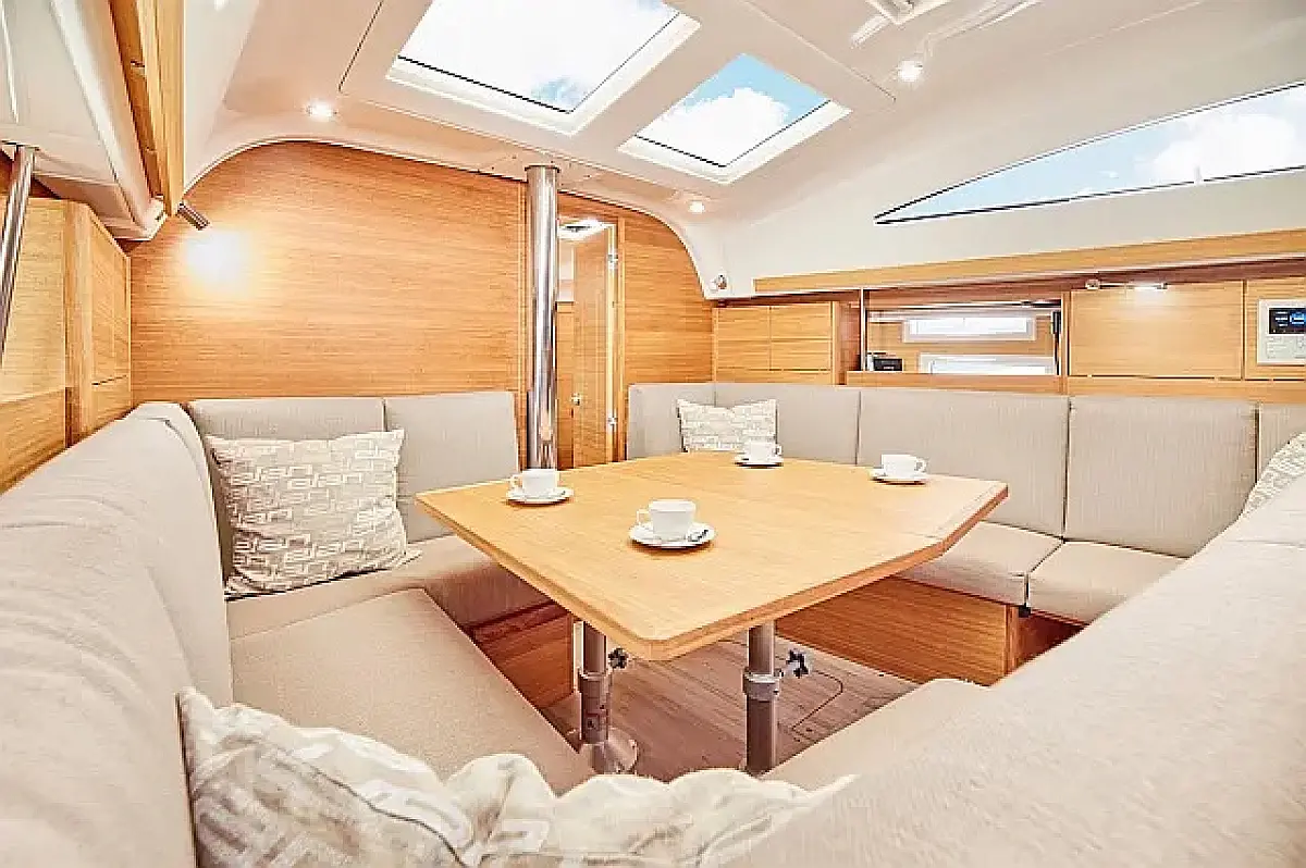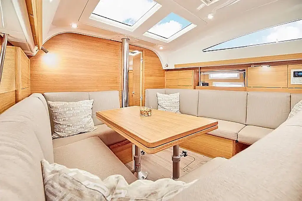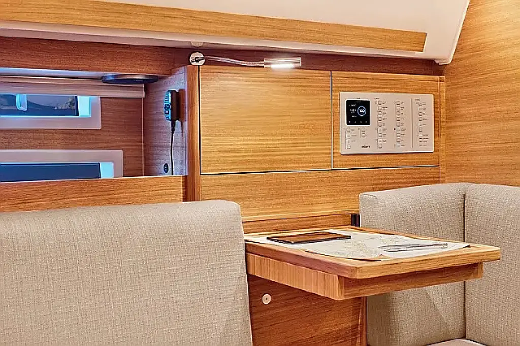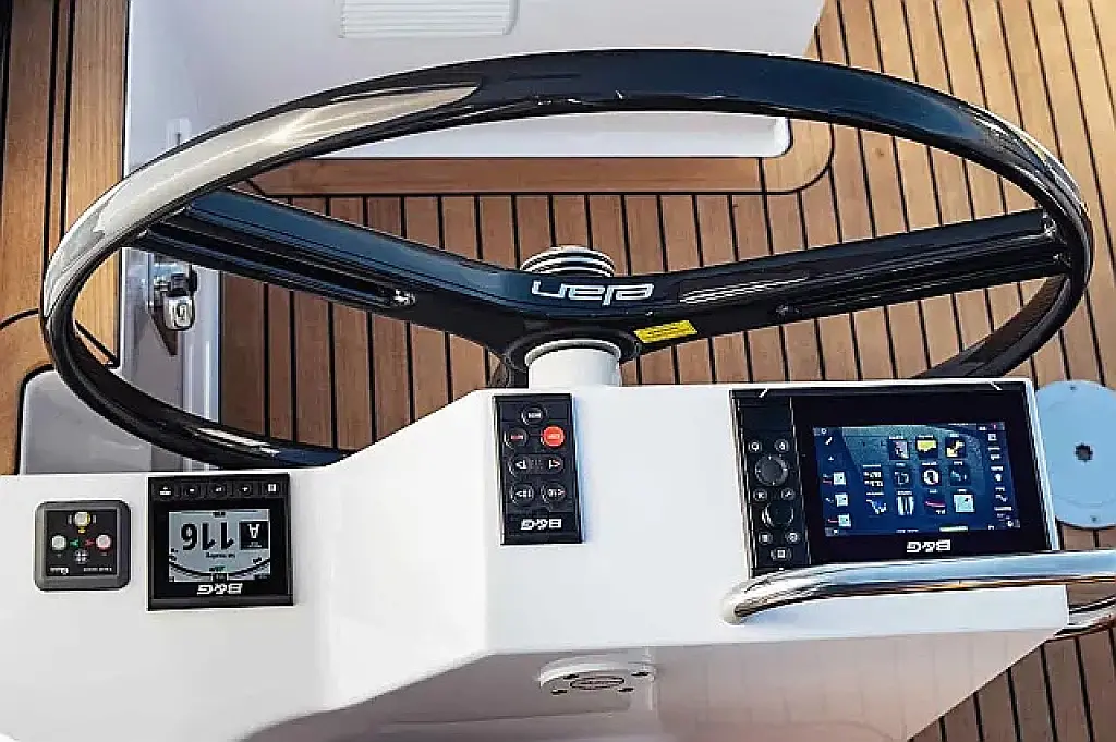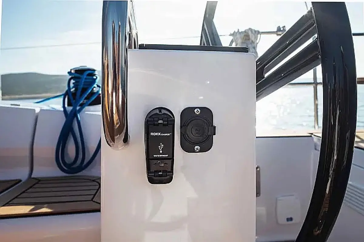 Simplattform, Soltak, cockpitkuddar, Sittbrunnshögtalare, Gummibåt, Kylskåp, Elektrisk toalett, Värmare, Septiktank, Inverter, Sprayhood, teak cockpit, Wi-Fi och Internet