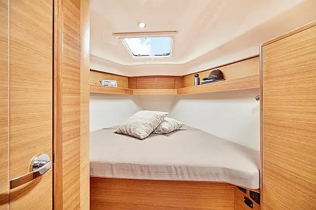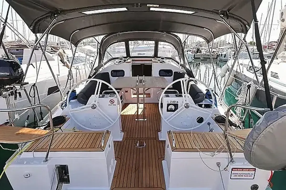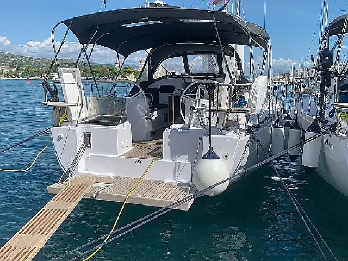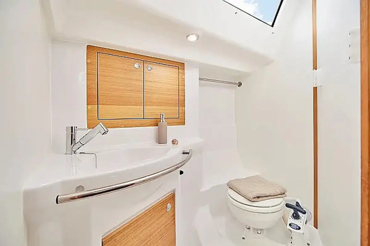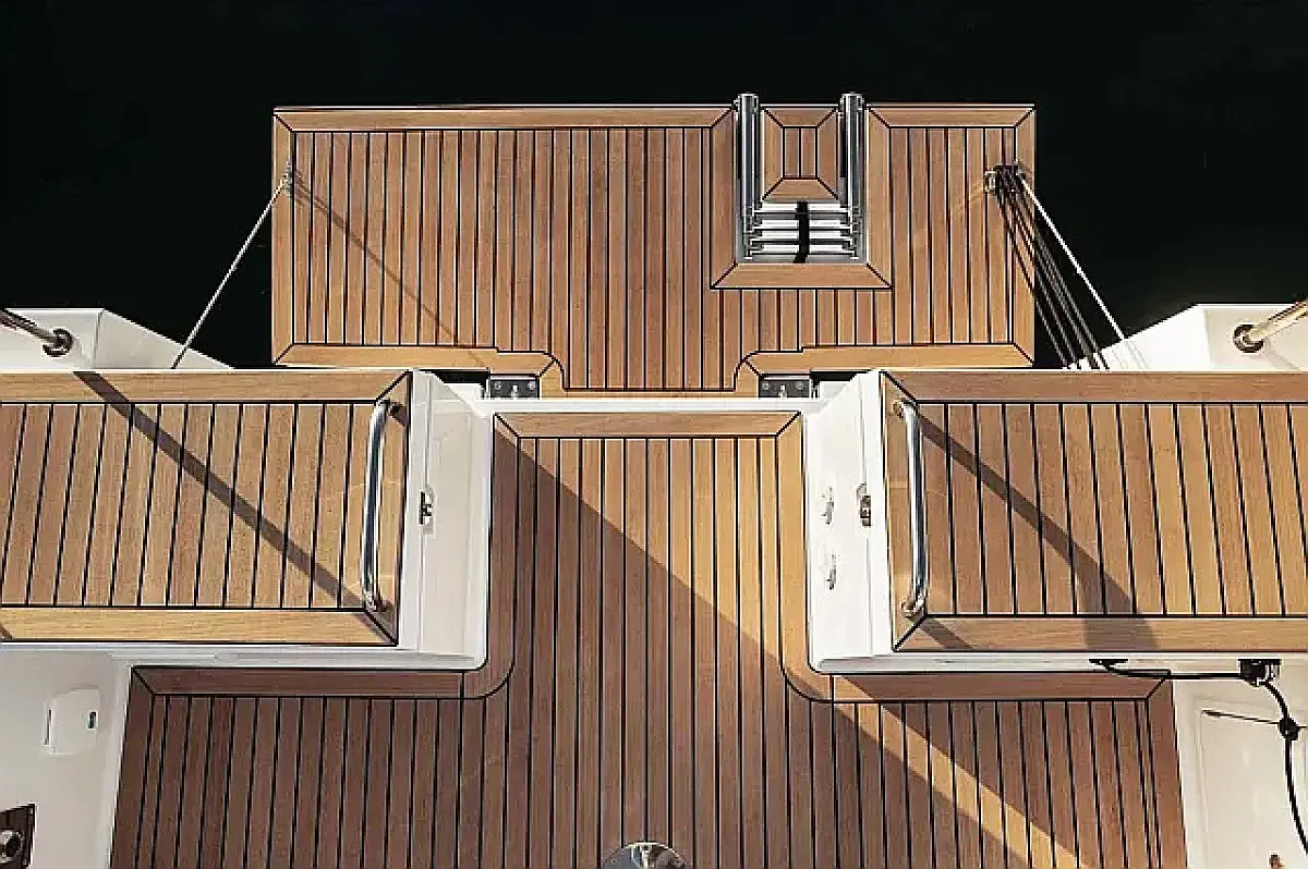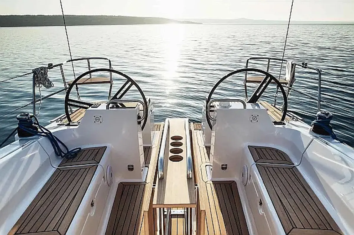 Simplattform, Soltak, cockpitkuddar, Sittbrunnshögtalare, Gummibåt, Kylskåp, Elektrisk toalett, Värmare, Septiktank, Inverter, Sprayhood, teak cockpit, Wi-Fi och Internet