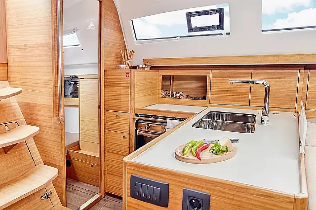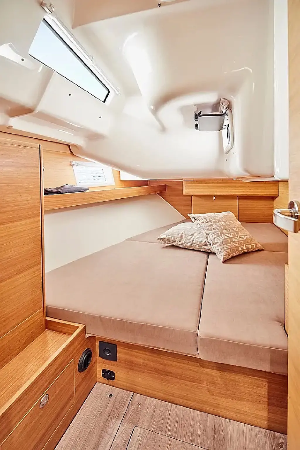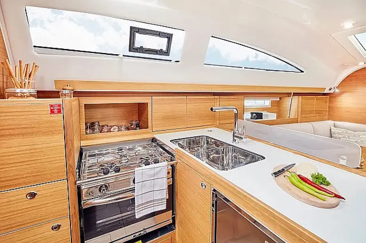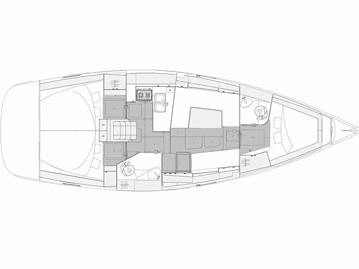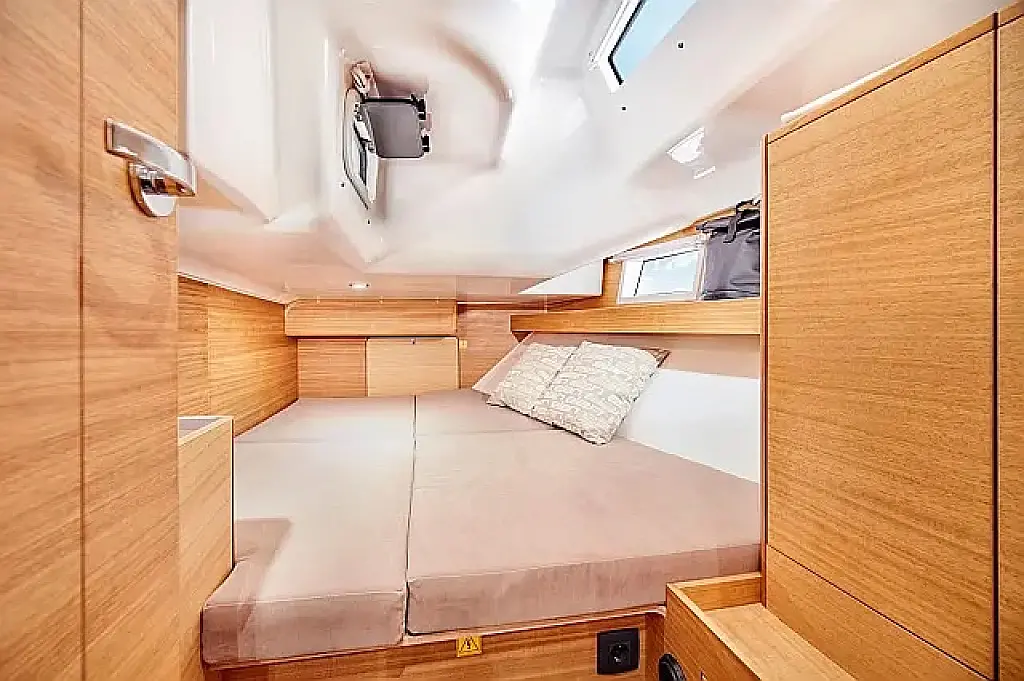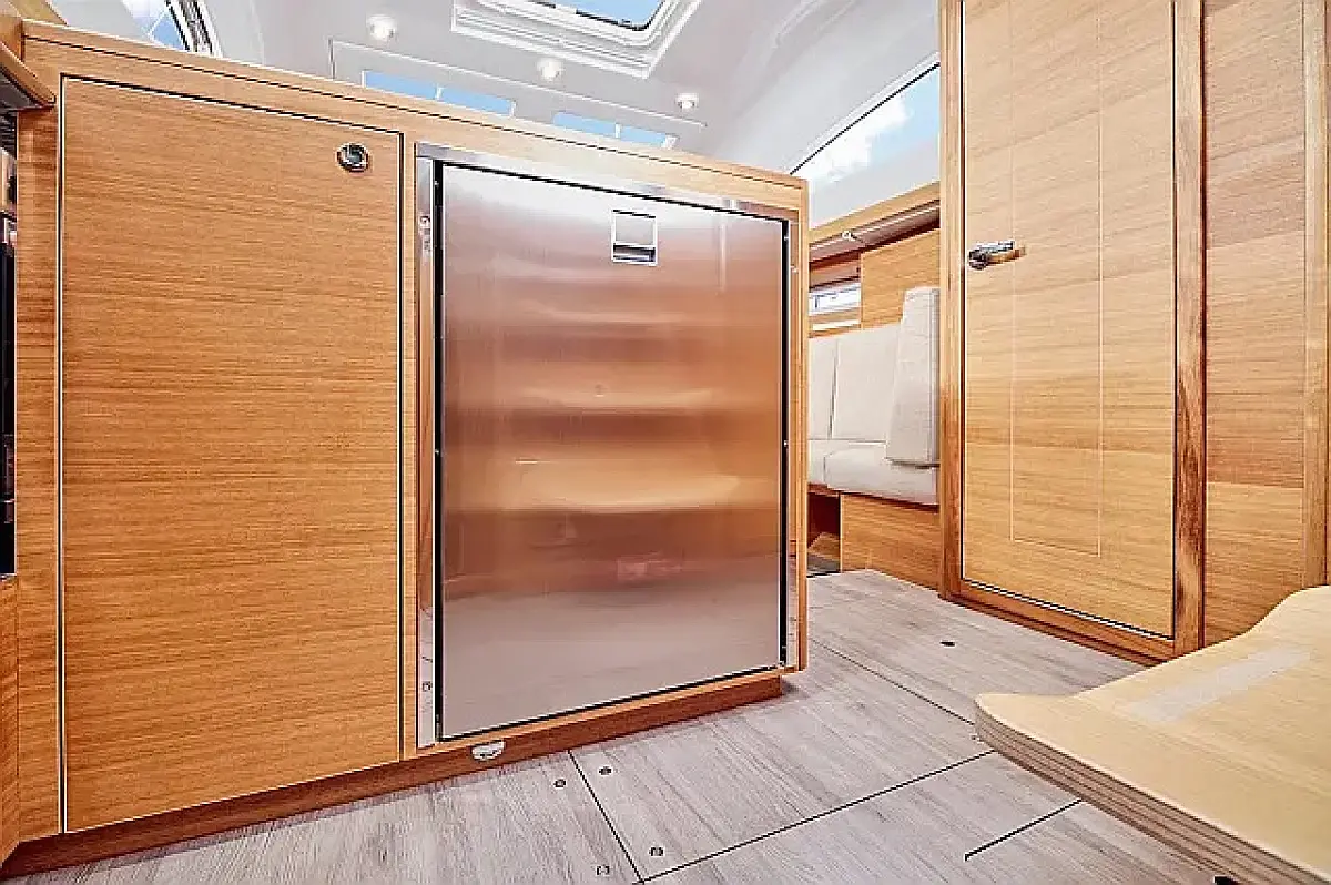 Simplattform, Soltak, cockpitkuddar, Sittbrunnshögtalare, Gummibåt, Kylskåp, Elektrisk toalett, Värmare, Septiktank, Inverter, Sprayhood, teak cockpit, Wi-Fi och Internet