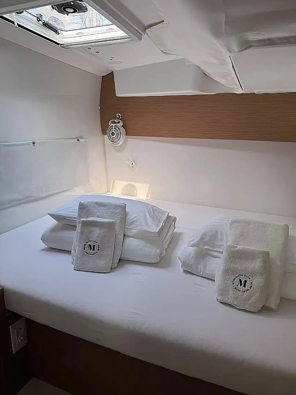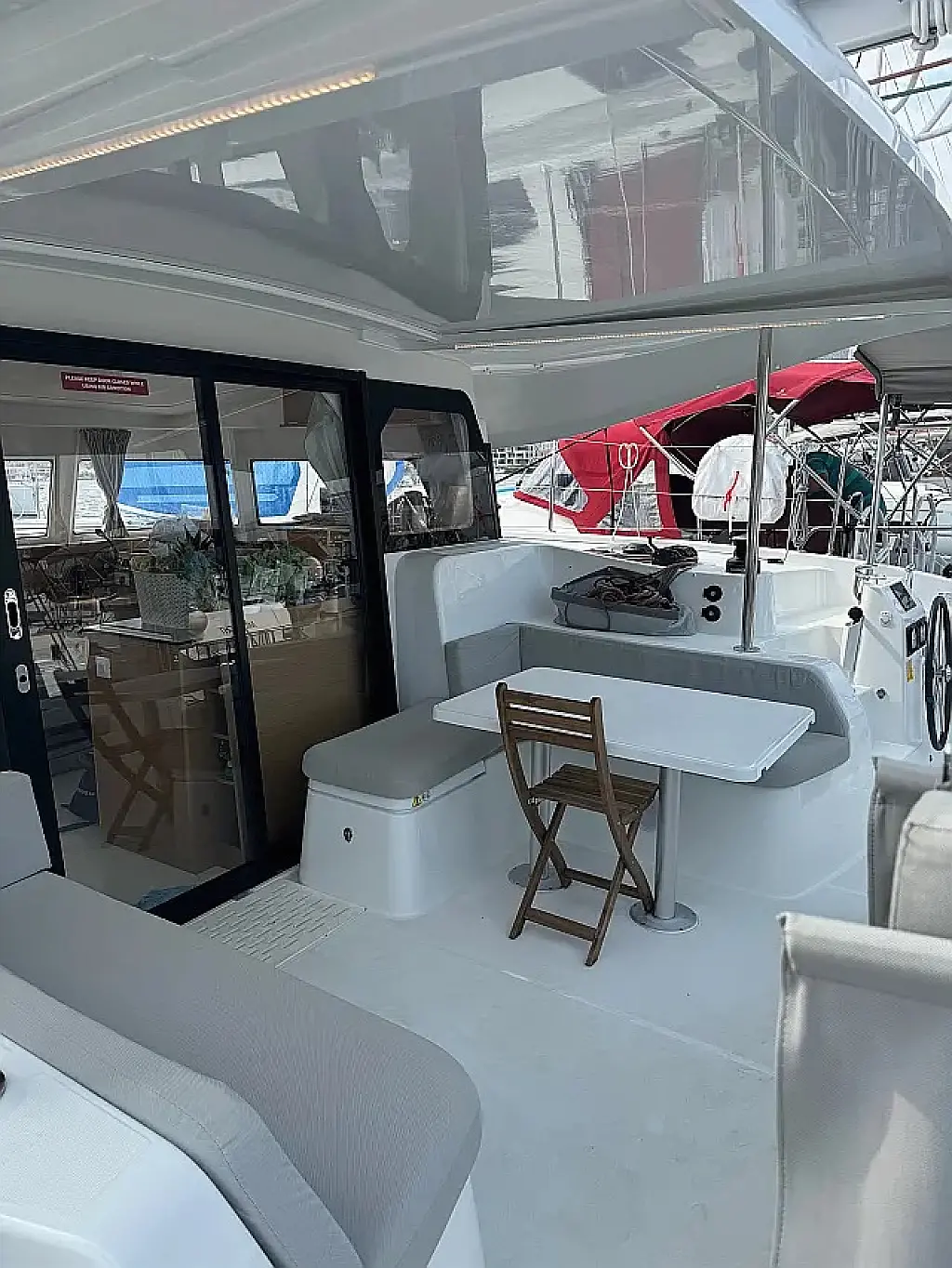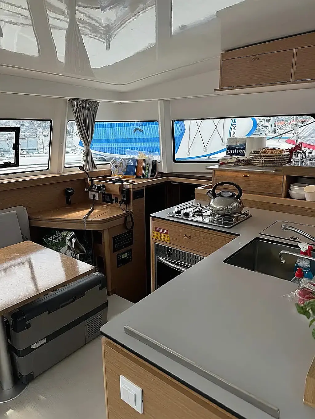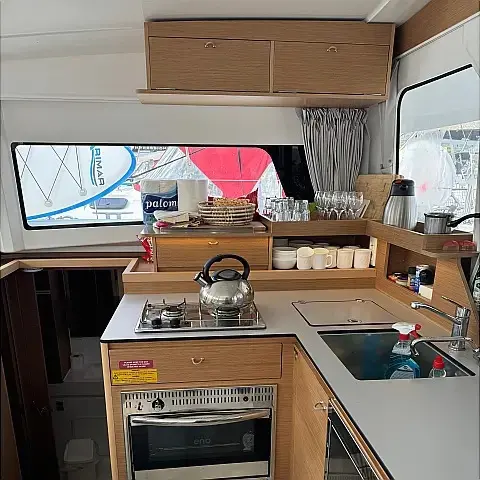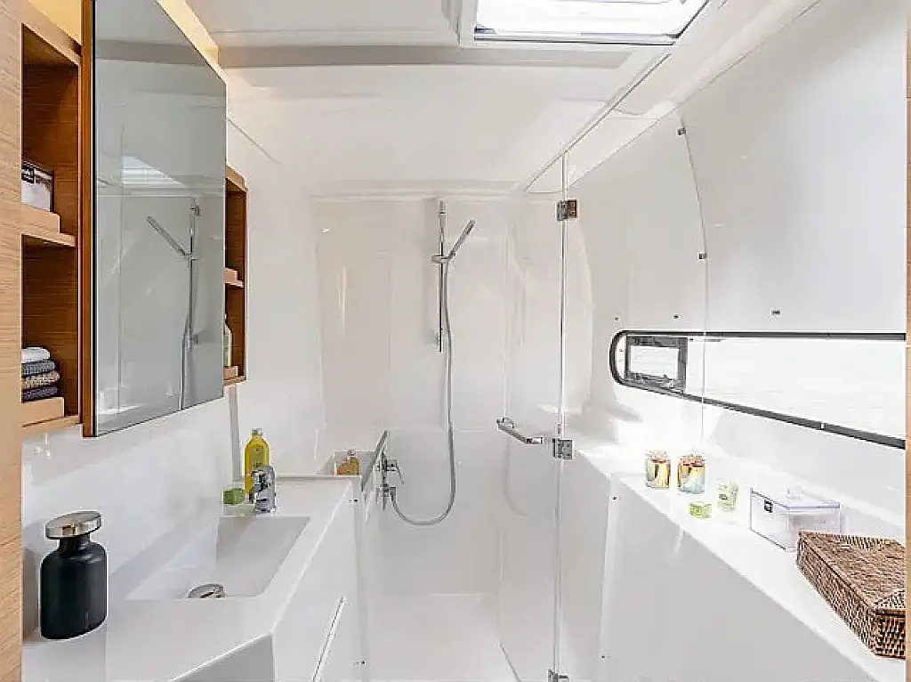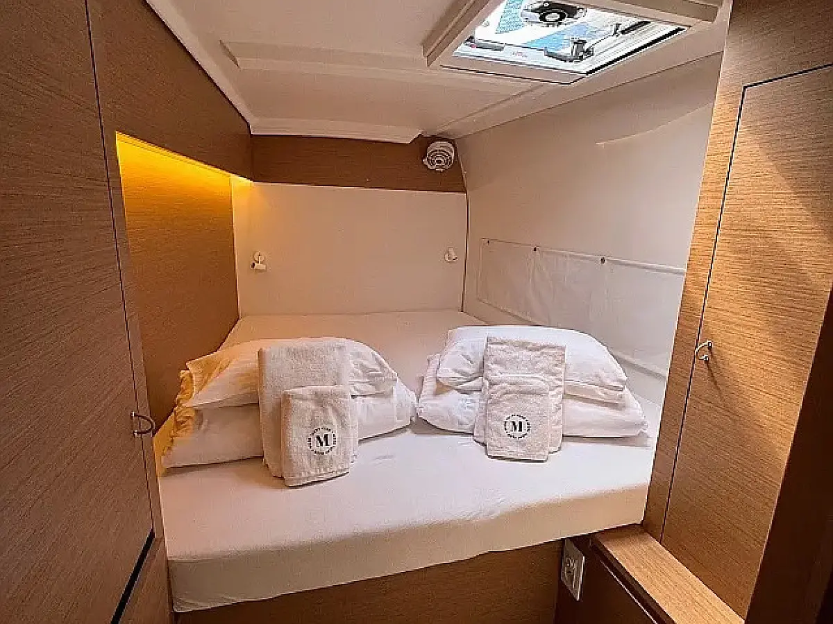 Luftkonditionering, Soltak, cockpitkuddar, Sittbrunnshögtalare, Gummibåt, Kaffemaskin, Kylskåp, Elektrisk toalett, Generator, Värmare, Septiktank, Inverter, Utombordsmotor, solpaneler, Wi-Fi och Internet
