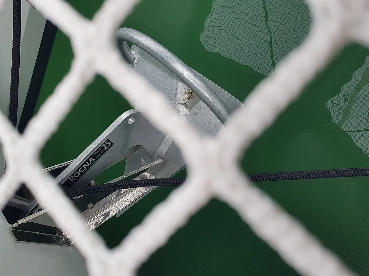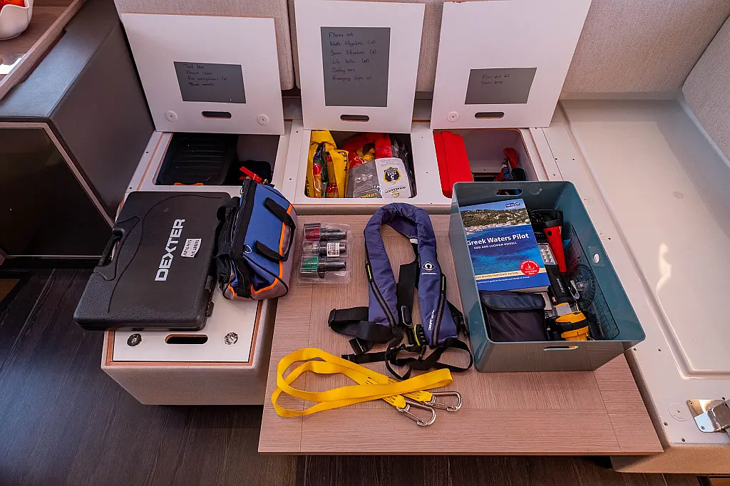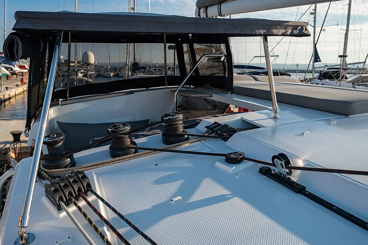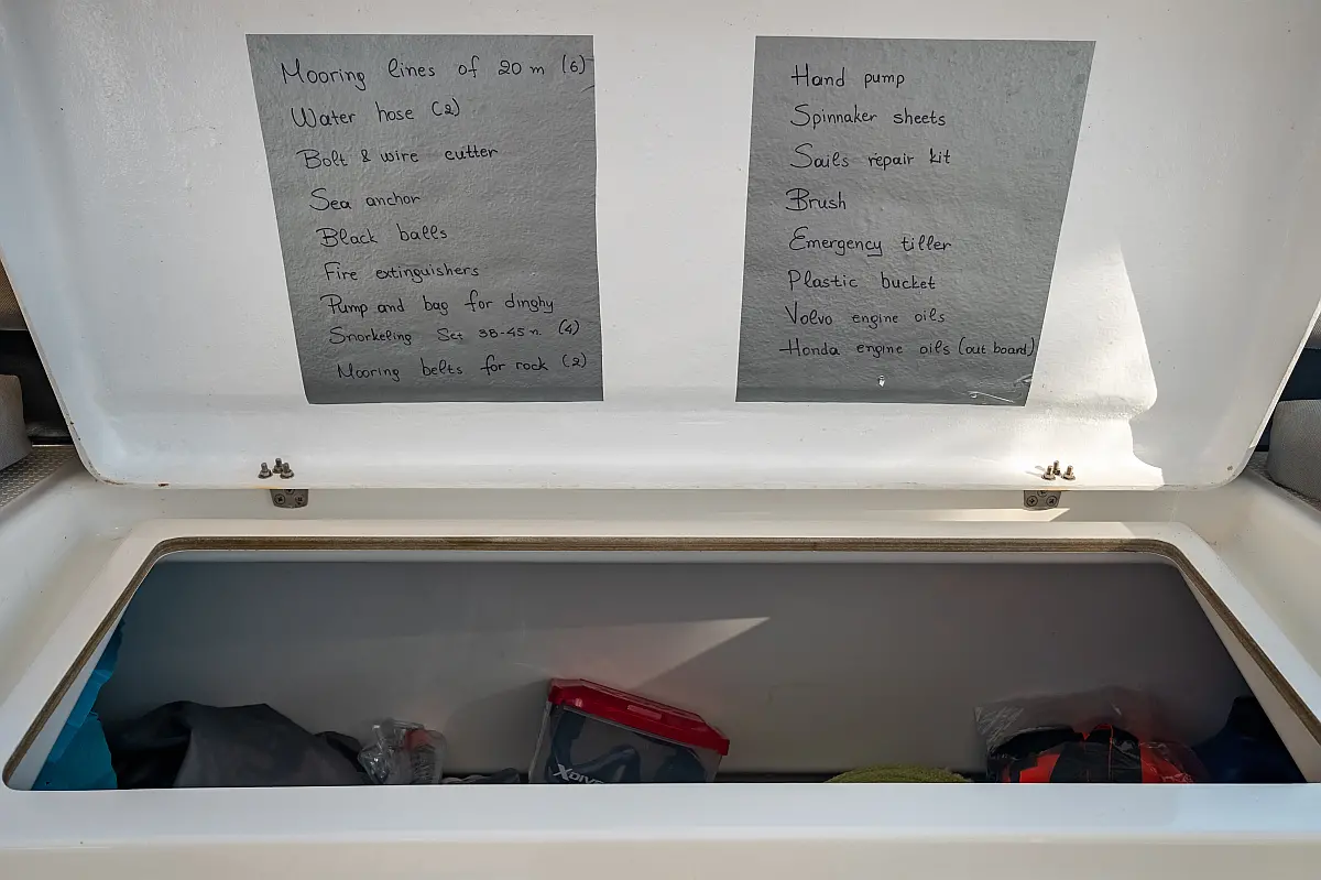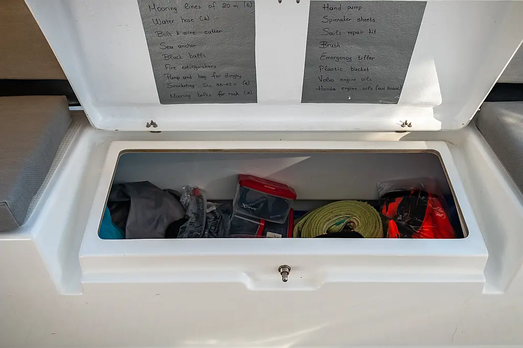 Kylskåp, Sittbrunnshögtalare, Elektriska vinschar, Gummibåt, Luftkonditionering, Generator, Inverter, Elektrisk toalett, solpaneler, vatten maker, Utombordsmotor, cockpitkuddar, teak cockpit