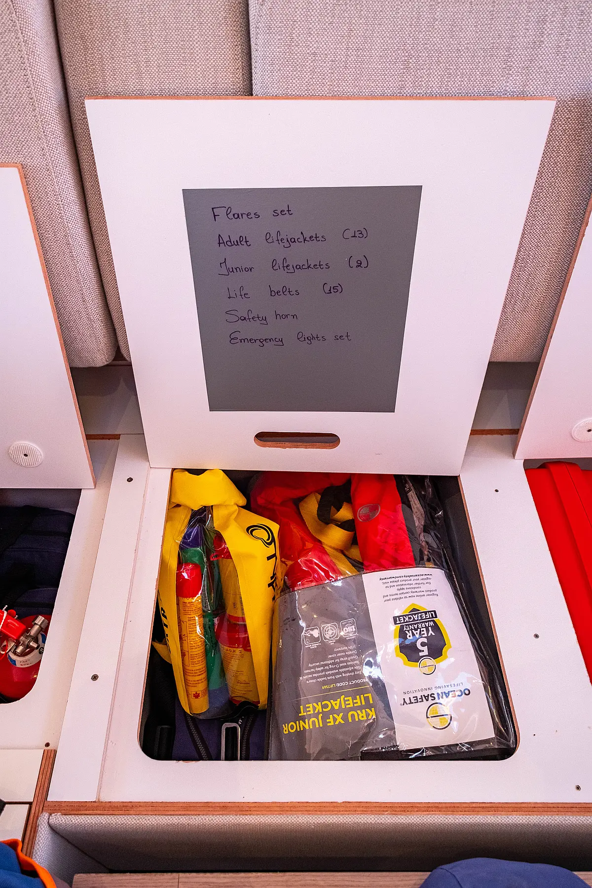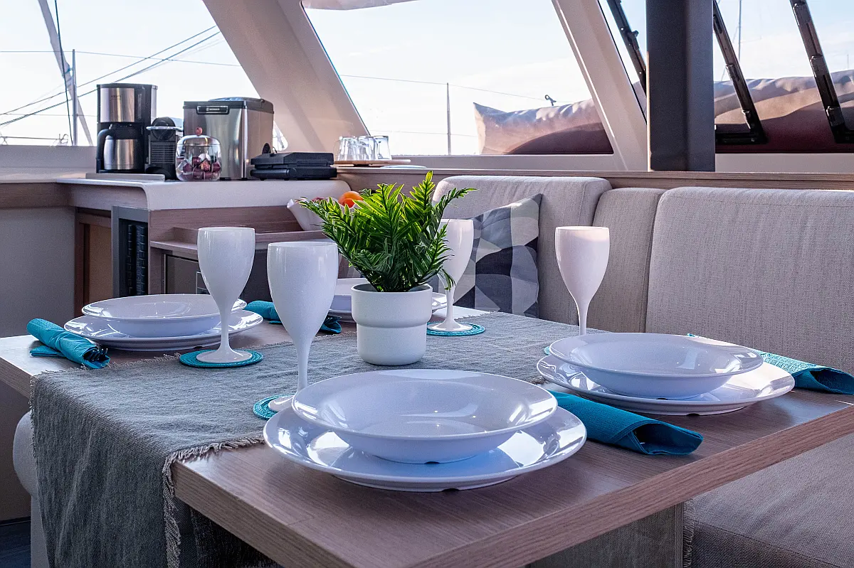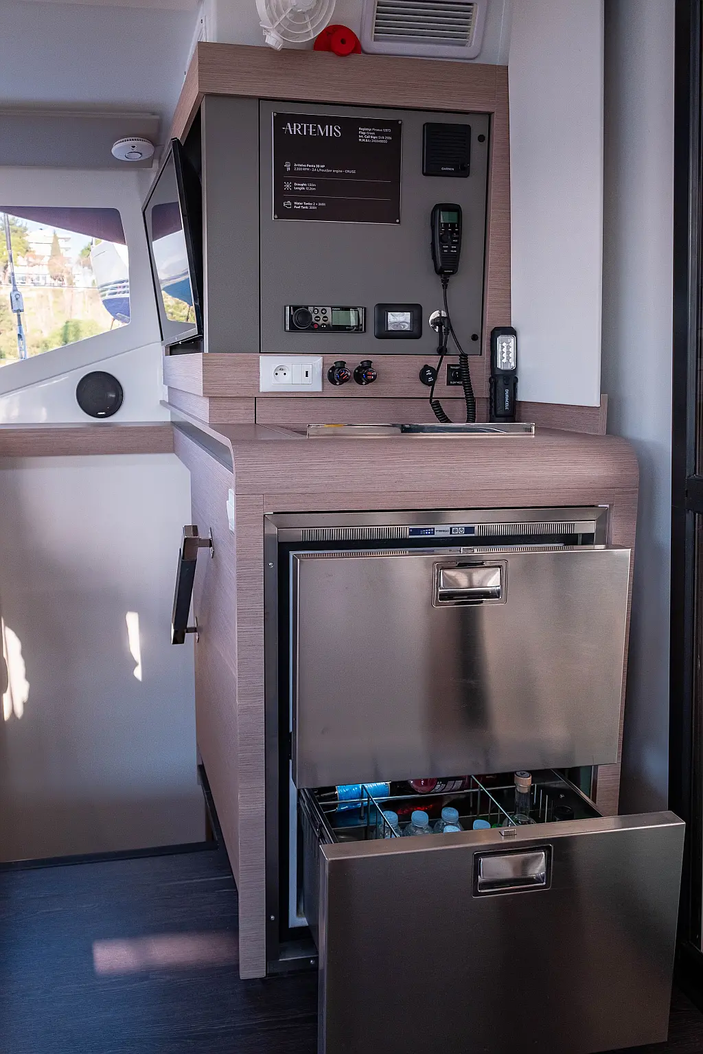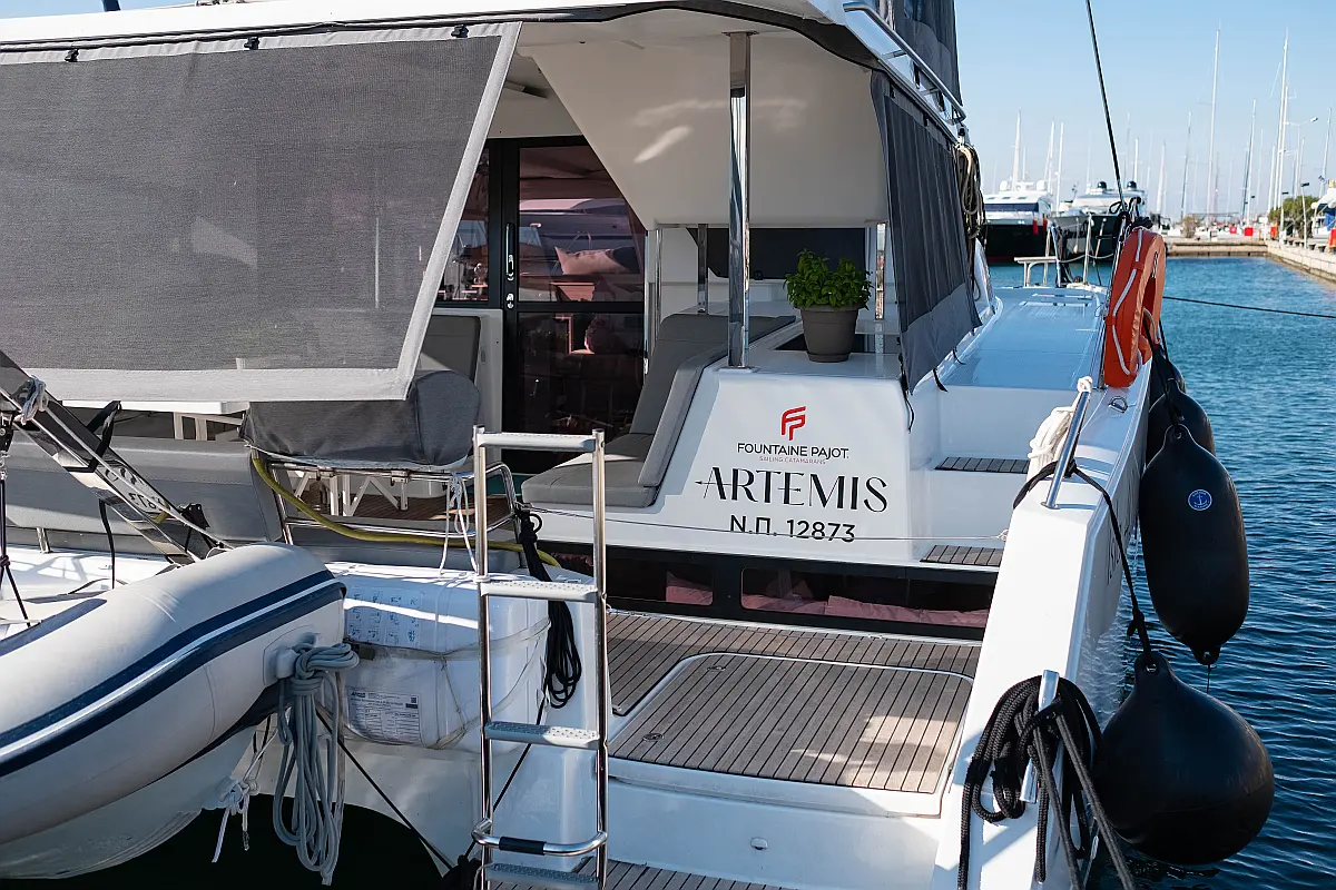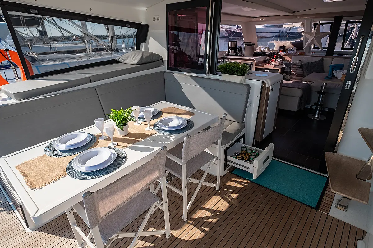 Kylskåp, Sittbrunnshögtalare, Elektriska vinschar, Gummibåt, Luftkonditionering, Generator, Inverter, Elektrisk toalett, solpaneler, vatten maker, Utombordsmotor, cockpitkuddar, teak cockpit