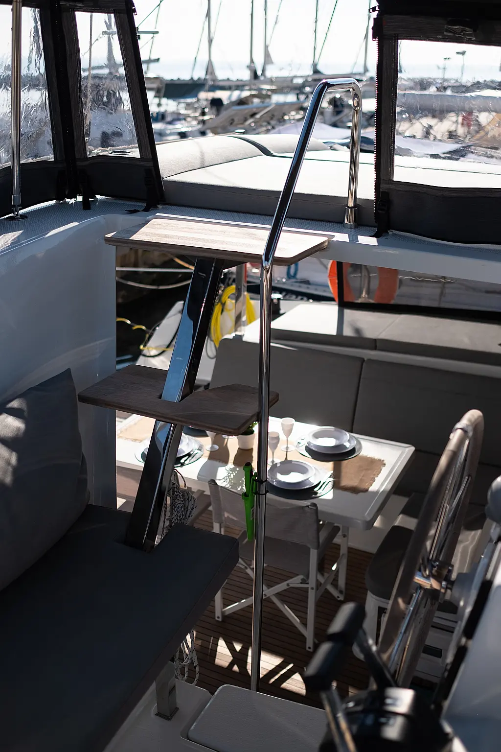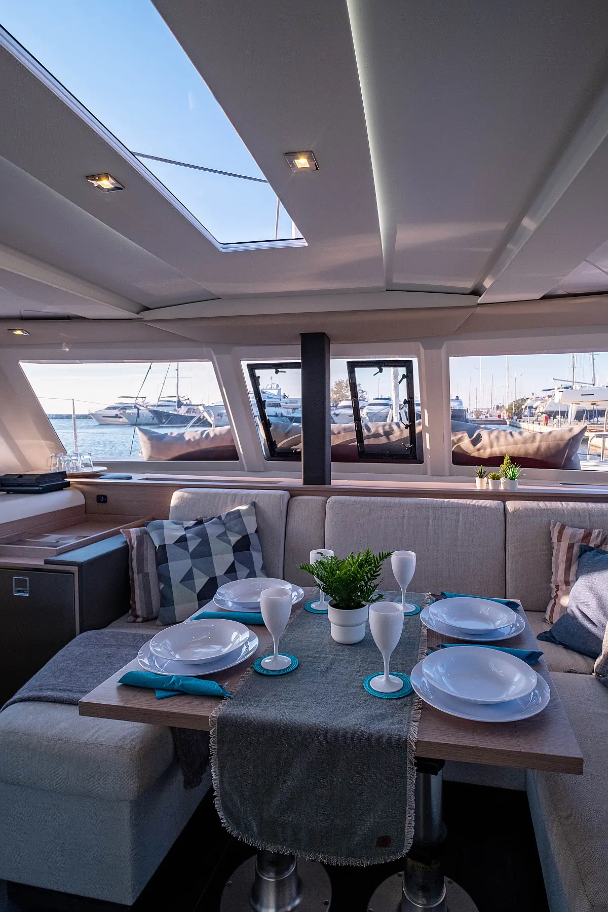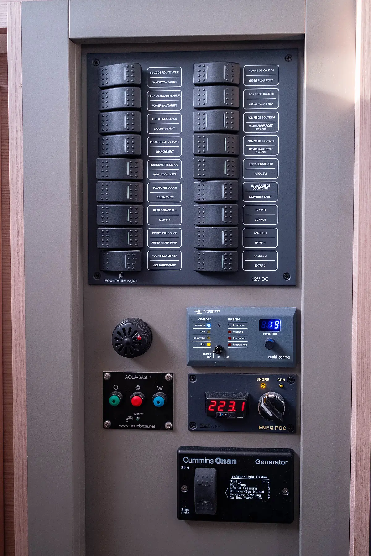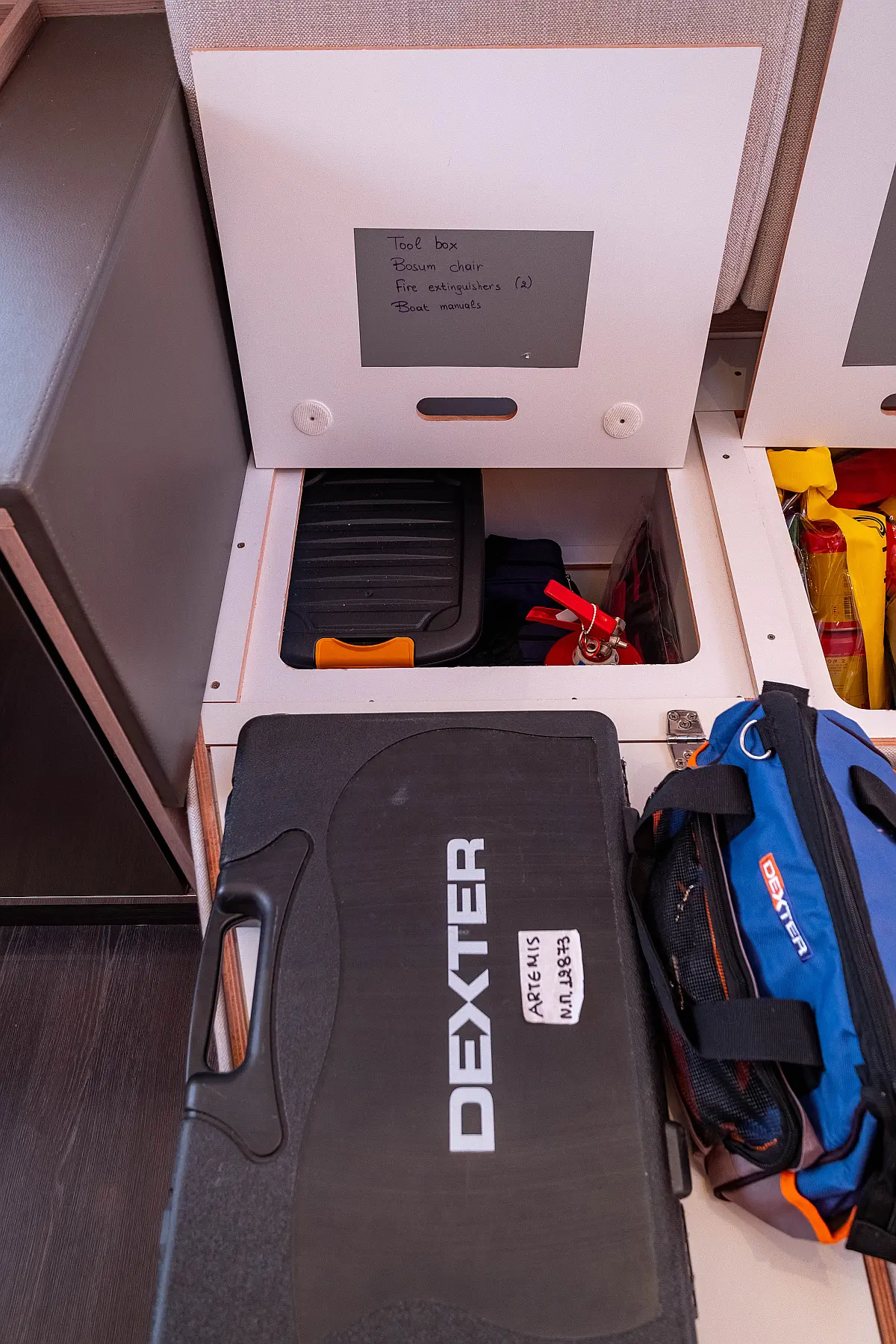 Kylskåp, Sittbrunnshögtalare, Elektriska vinschar, Gummibåt, Luftkonditionering, Generator, Inverter, Elektrisk toalett, solpaneler, vatten maker, Utombordsmotor, cockpitkuddar, teak cockpit