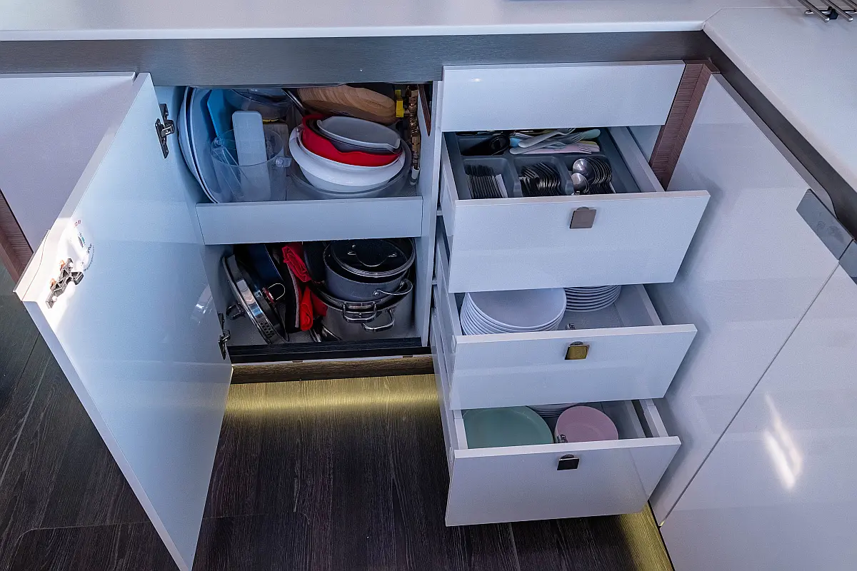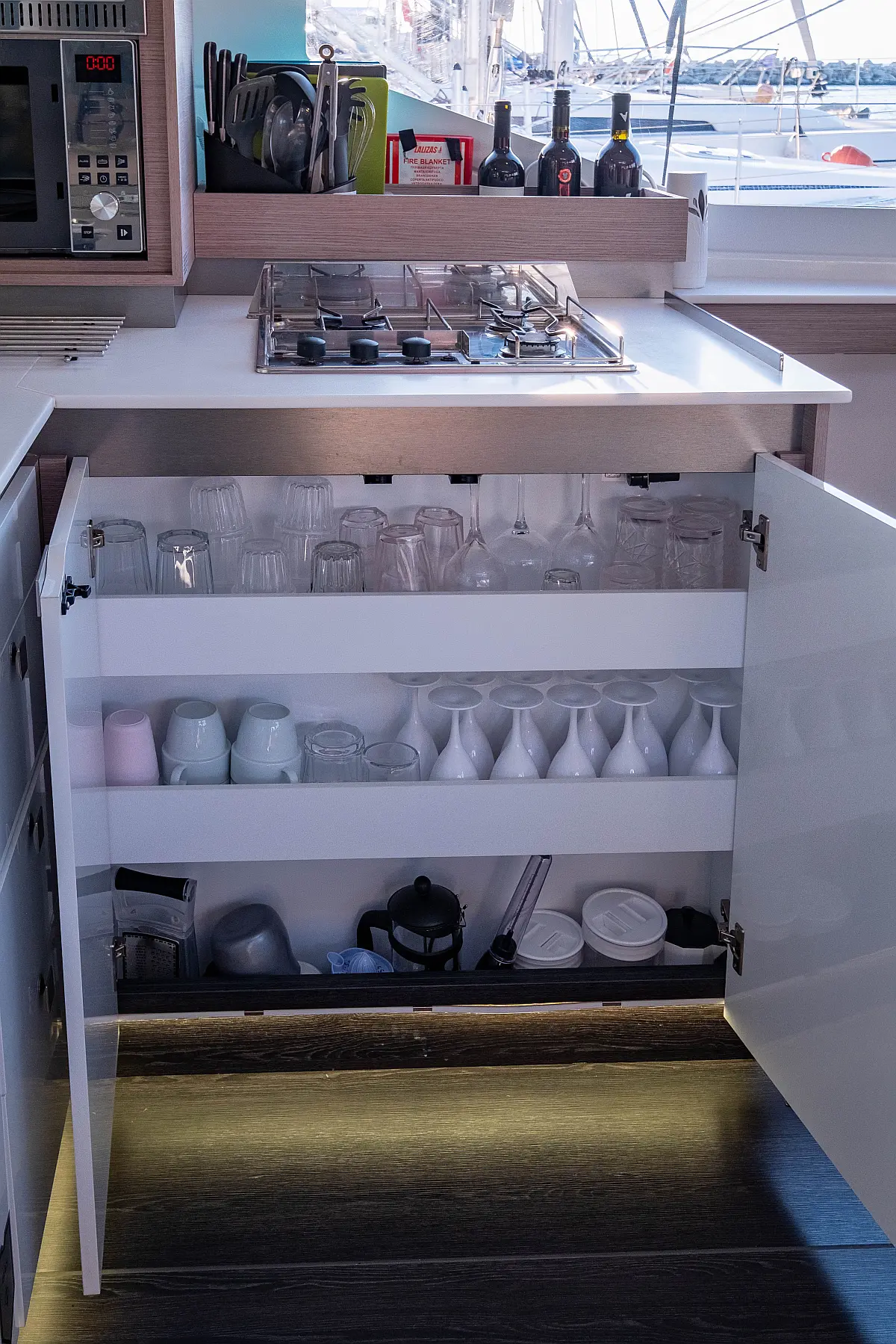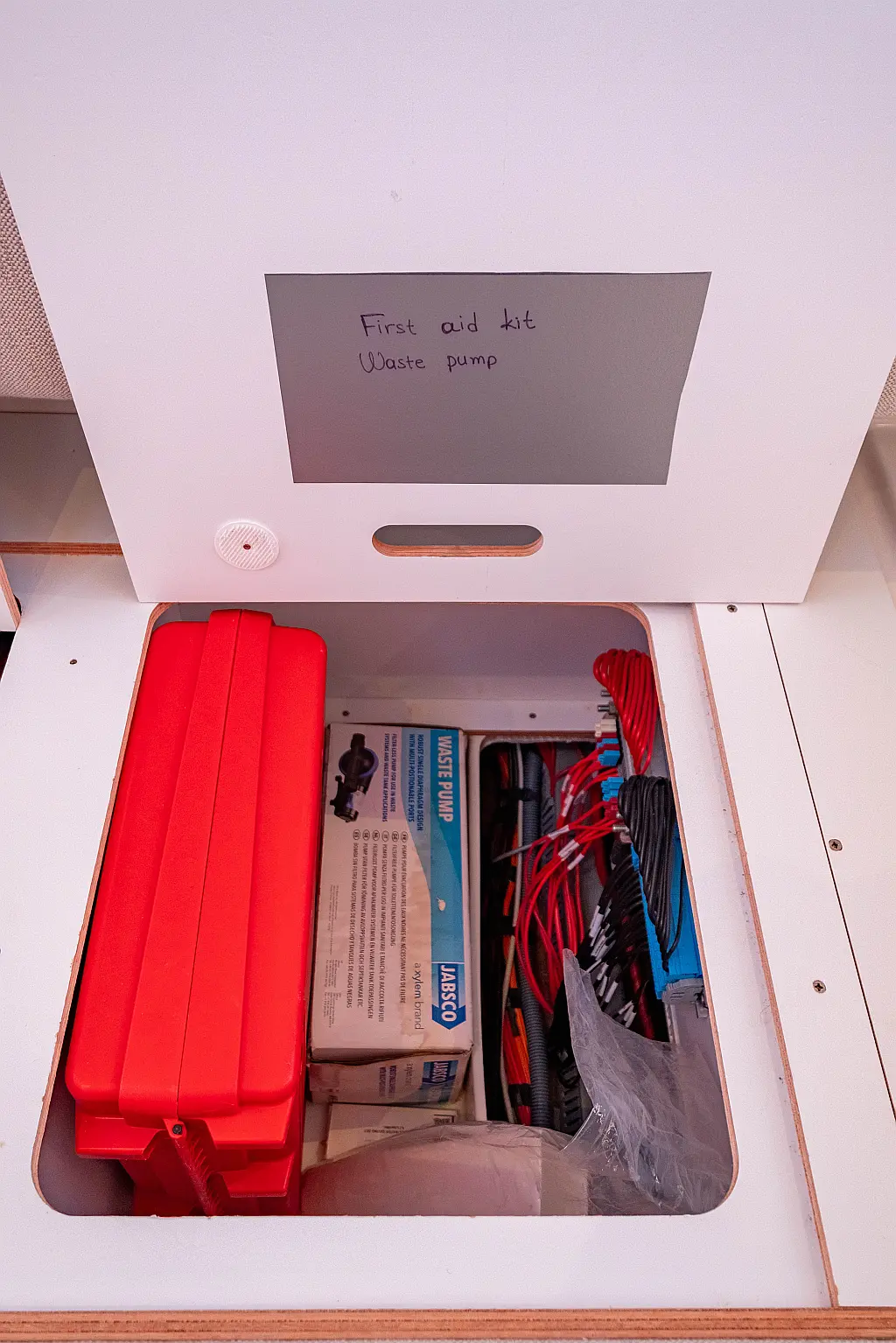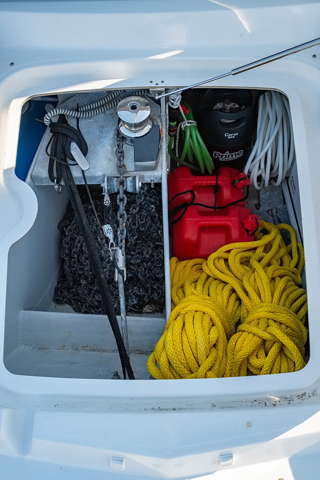 Kylskåp, Sittbrunnshögtalare, Elektriska vinschar, Gummibåt, Luftkonditionering, Generator, Inverter, Elektrisk toalett, solpaneler, vatten maker, Utombordsmotor, cockpitkuddar, teak cockpit