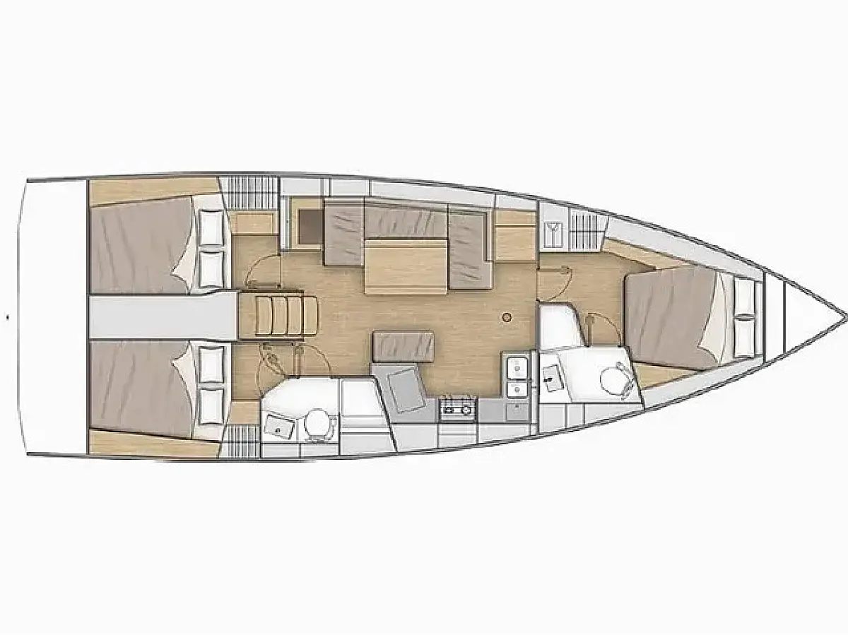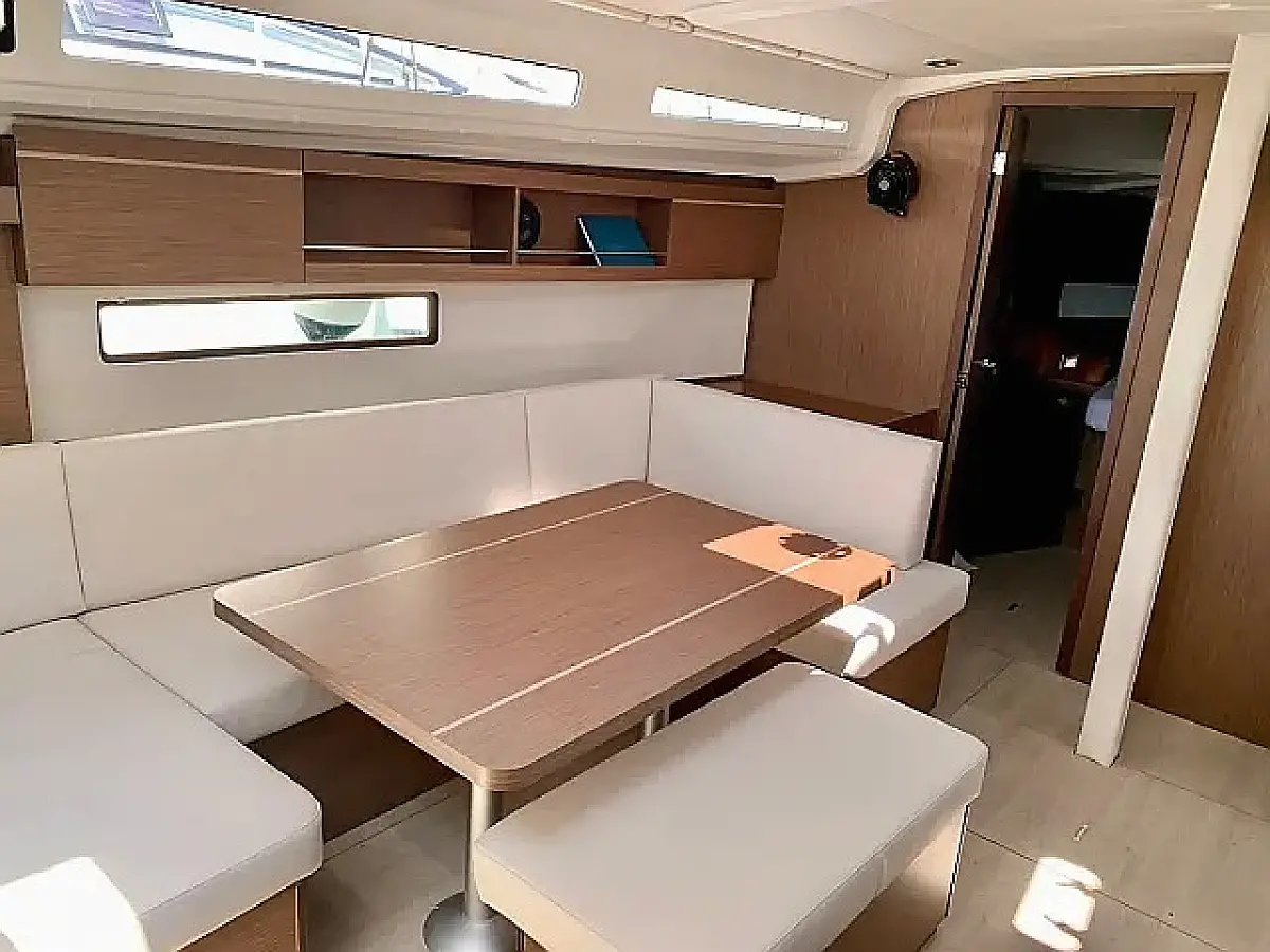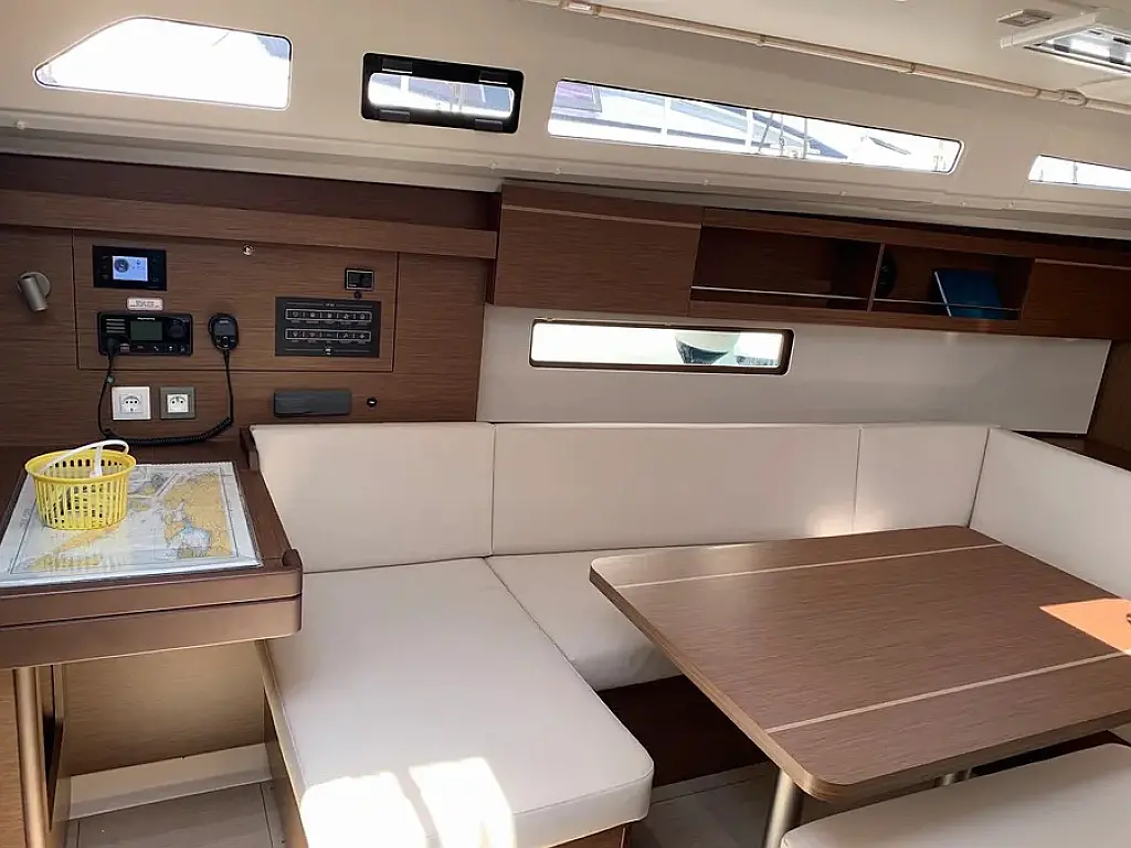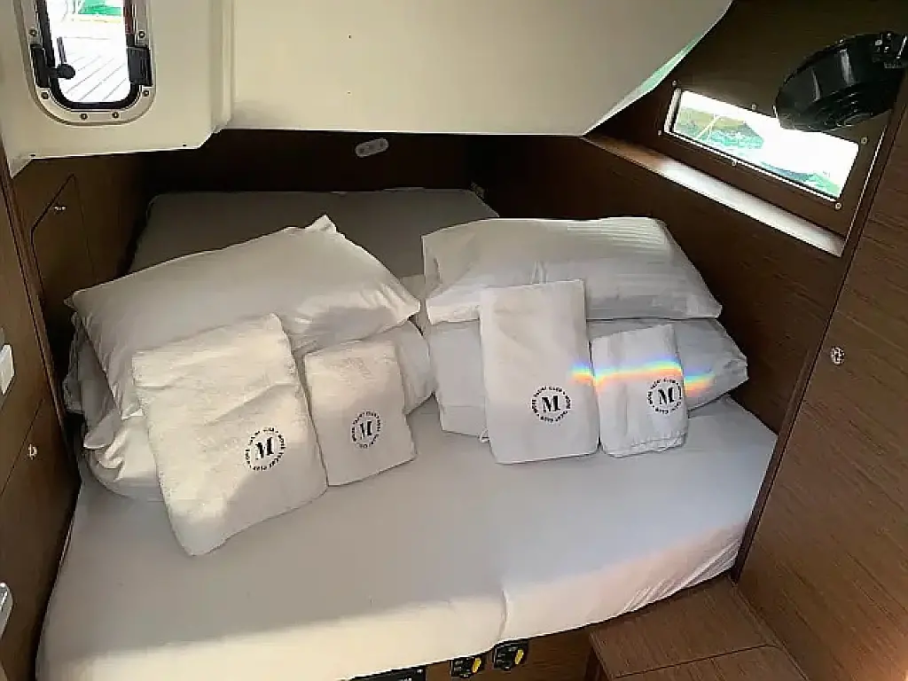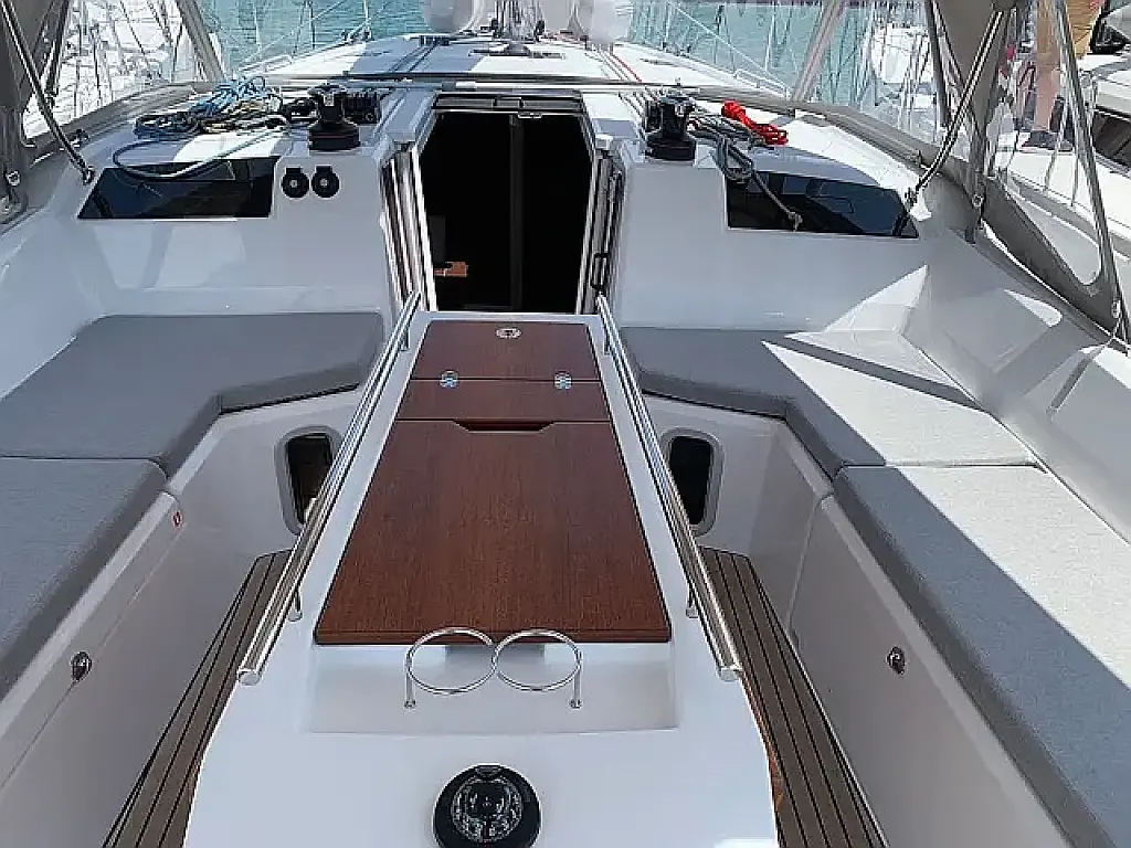 Simplattform, Soltak, cockpitkuddar, Sittbrunnshögtalare, Gummibåt, Kylskåp, Elektrisk toalett, Värmare, Septiktank, Inverter, Sprayhood, teak cockpit, Wi-Fi och Internet